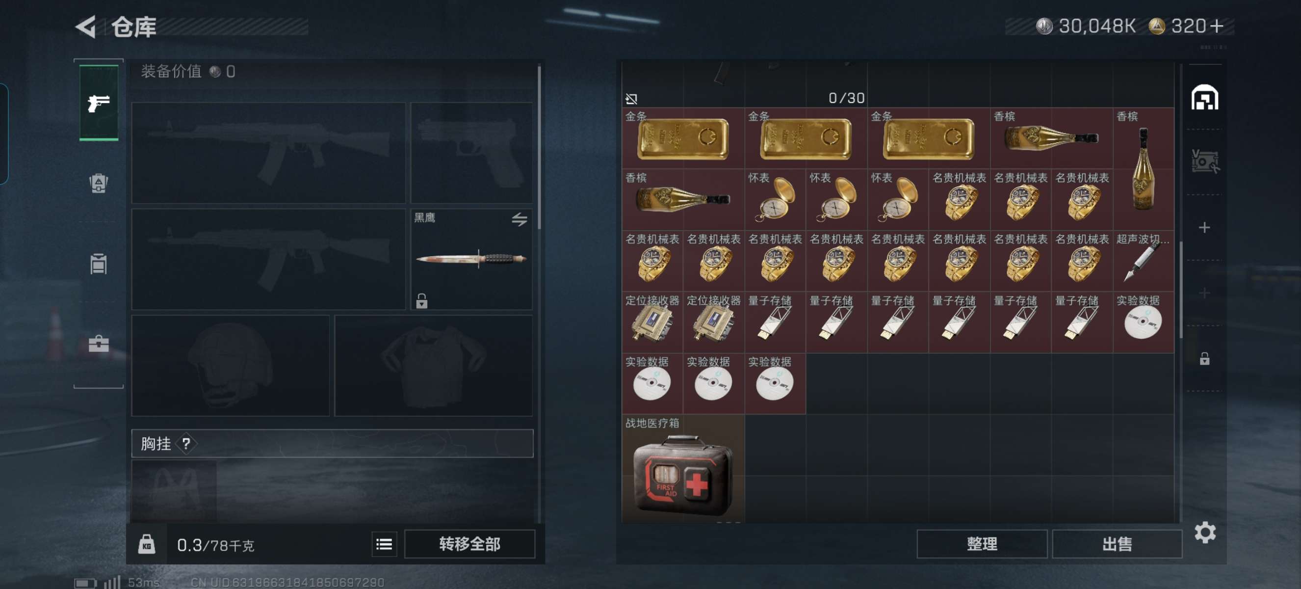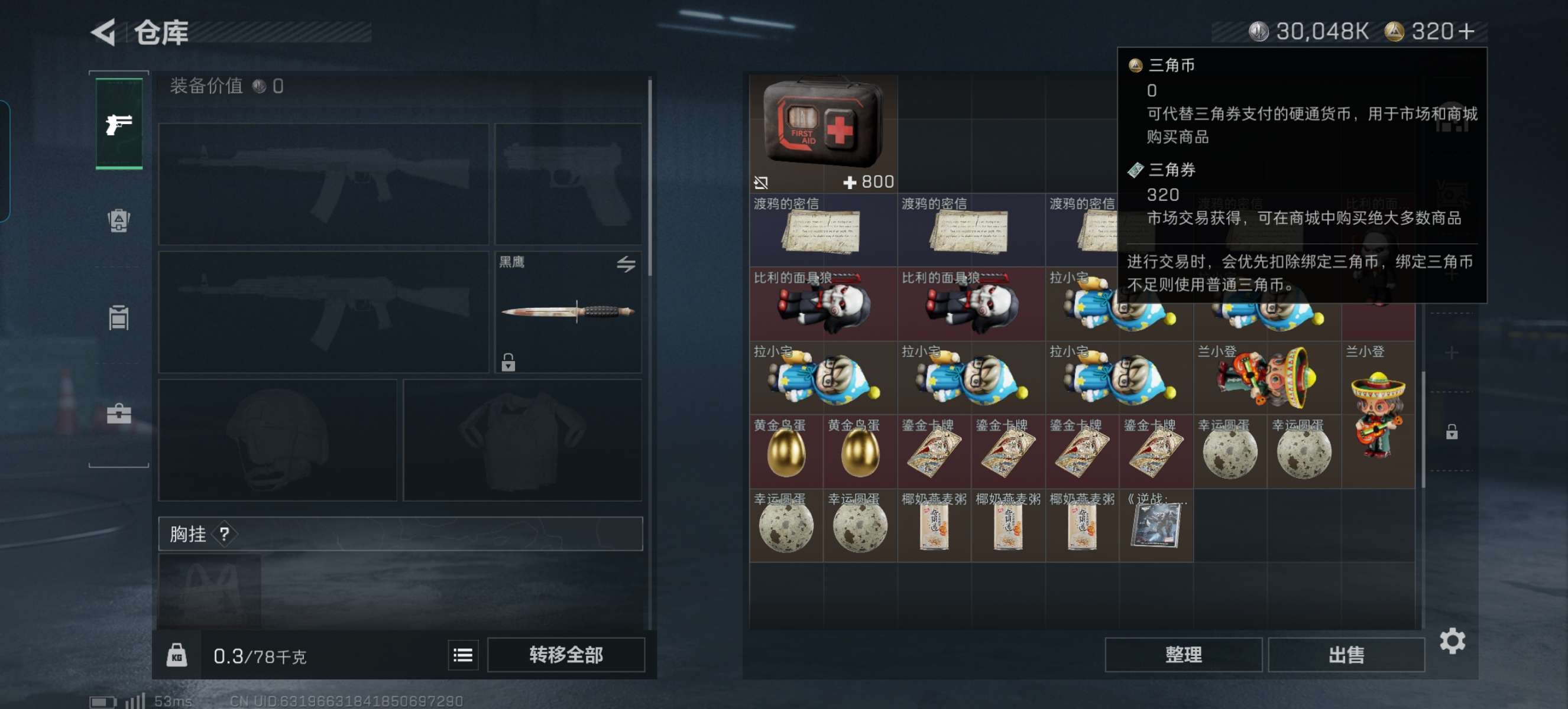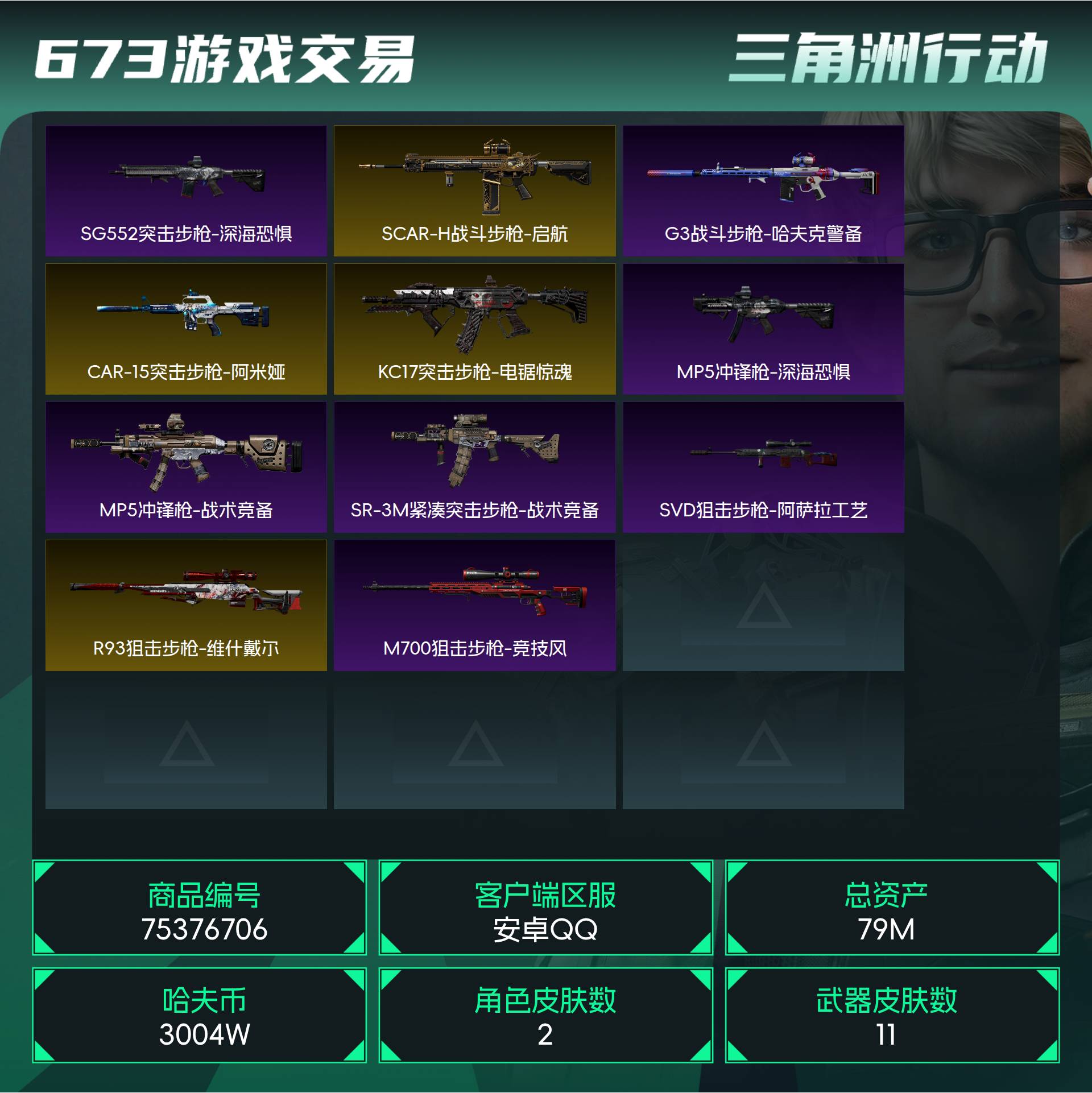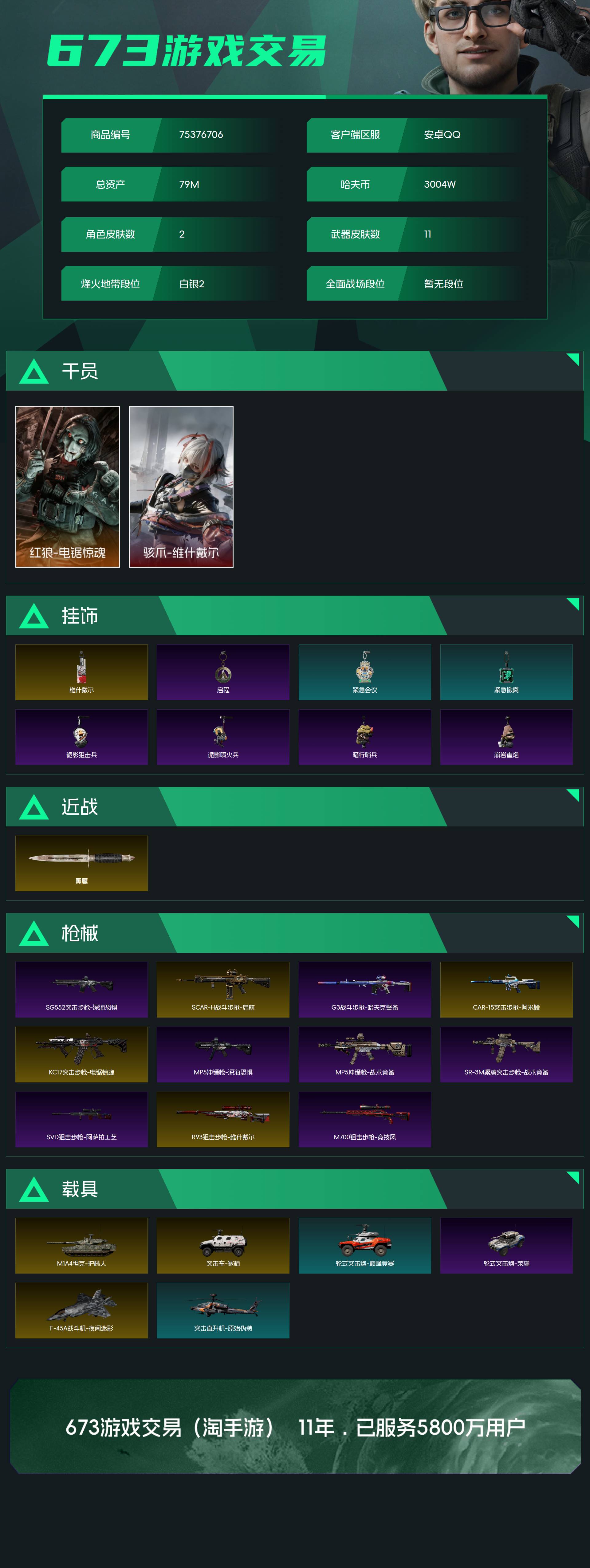 烽火段位白银2 战场段位暂无段位 总资产79M 哈夫币3004W 干员2 挂饰8 近战1 枪械11