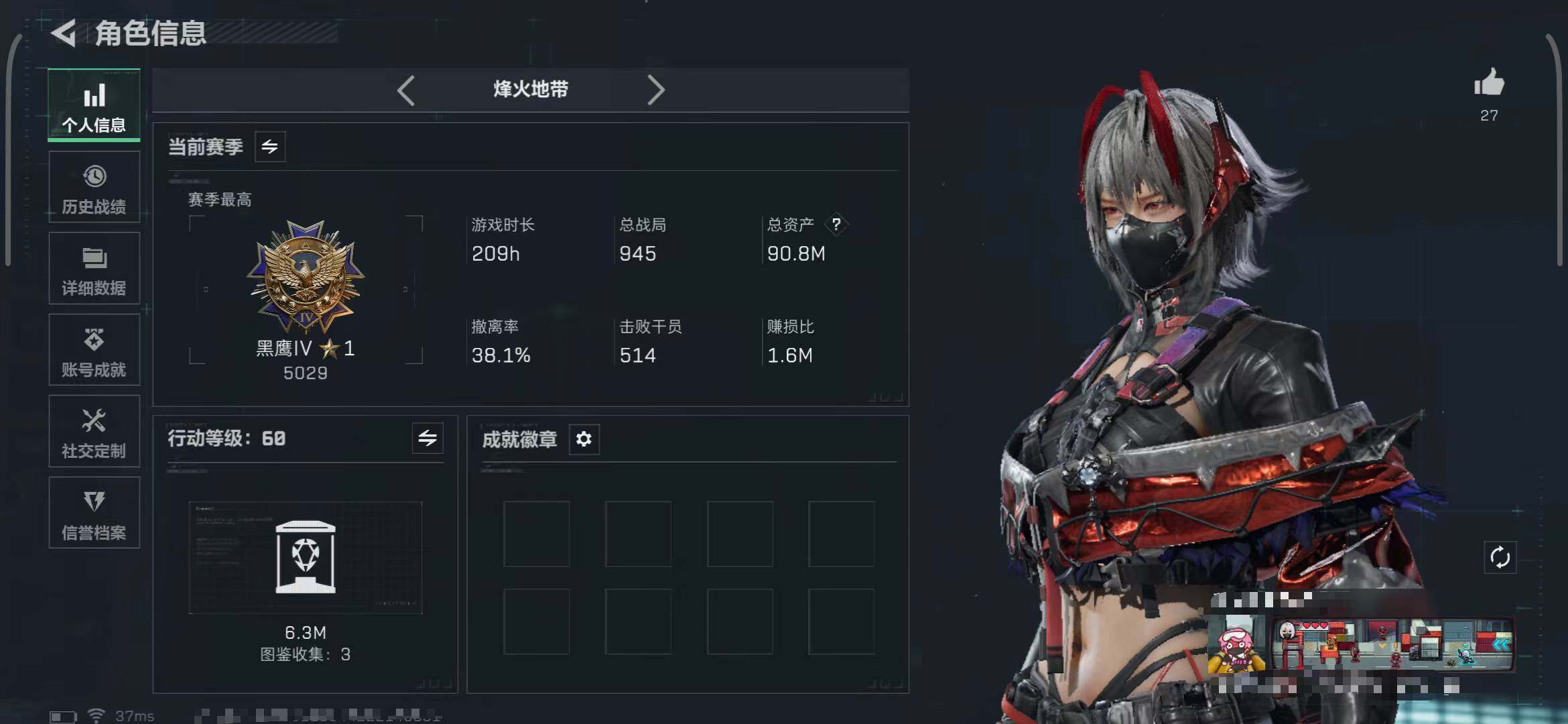 总资产(M):90M/哈夫币(K):5332K/传说枪皮数:8/全面战场等级:6_段位:列兵/烽火地带等级:60_段位:黑鹰