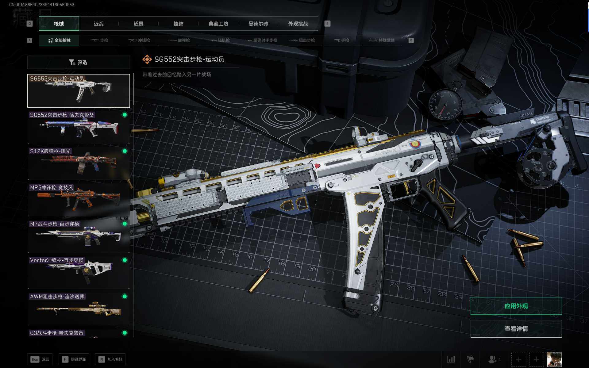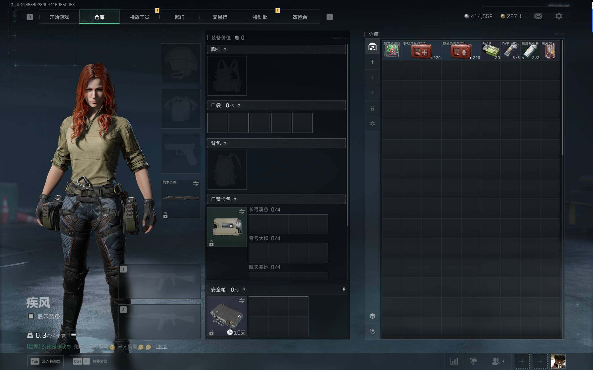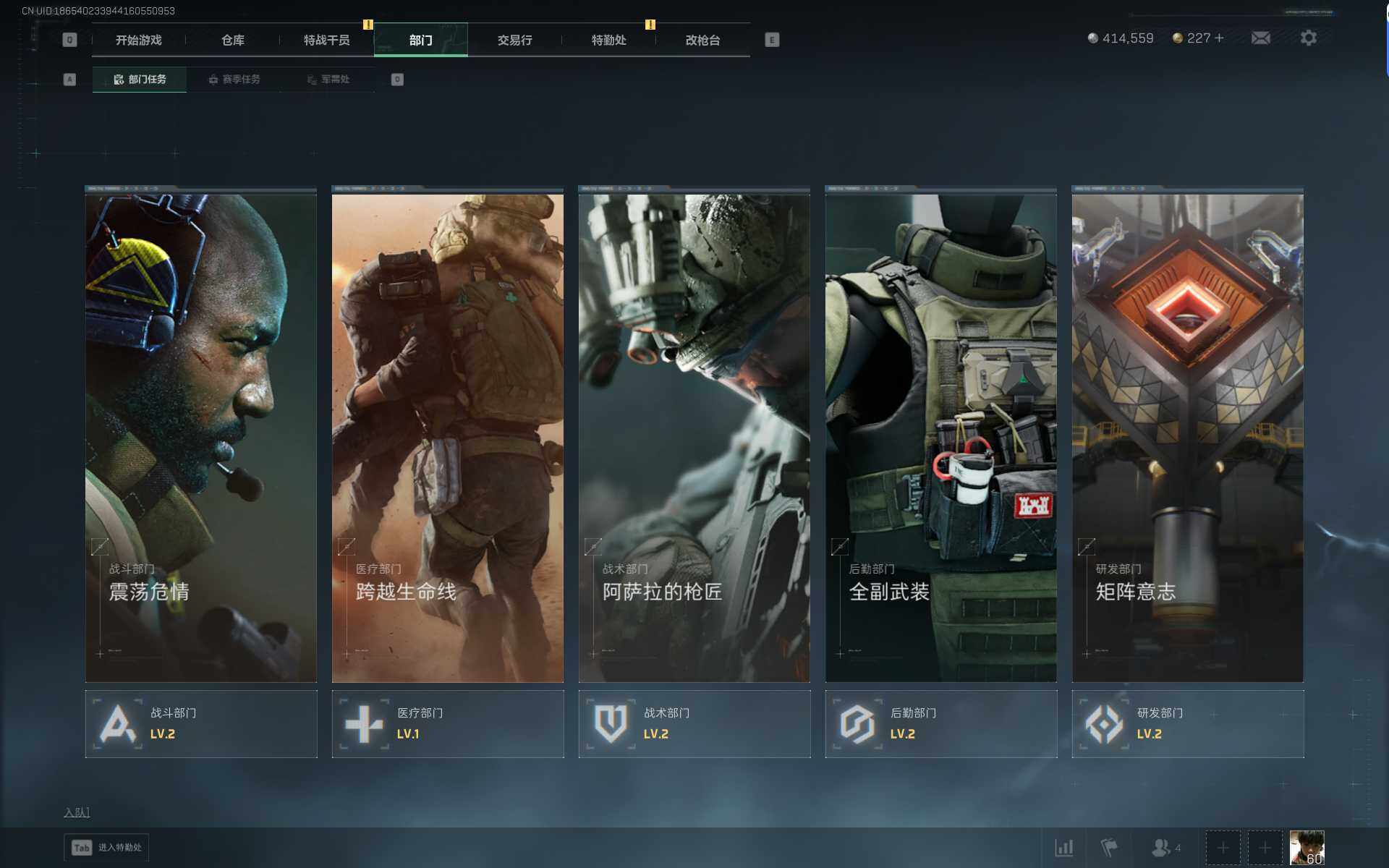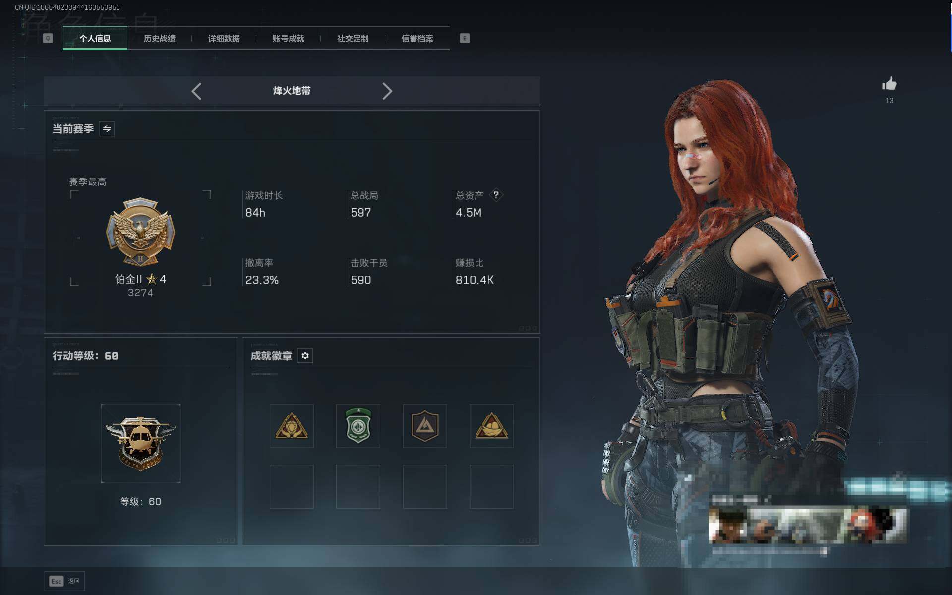 总资产(M):4M/哈夫币(K):414K传说枪皮数:1/全面战场等级:7_段位:列兵/烽火地带等级:60_段位:铂金/