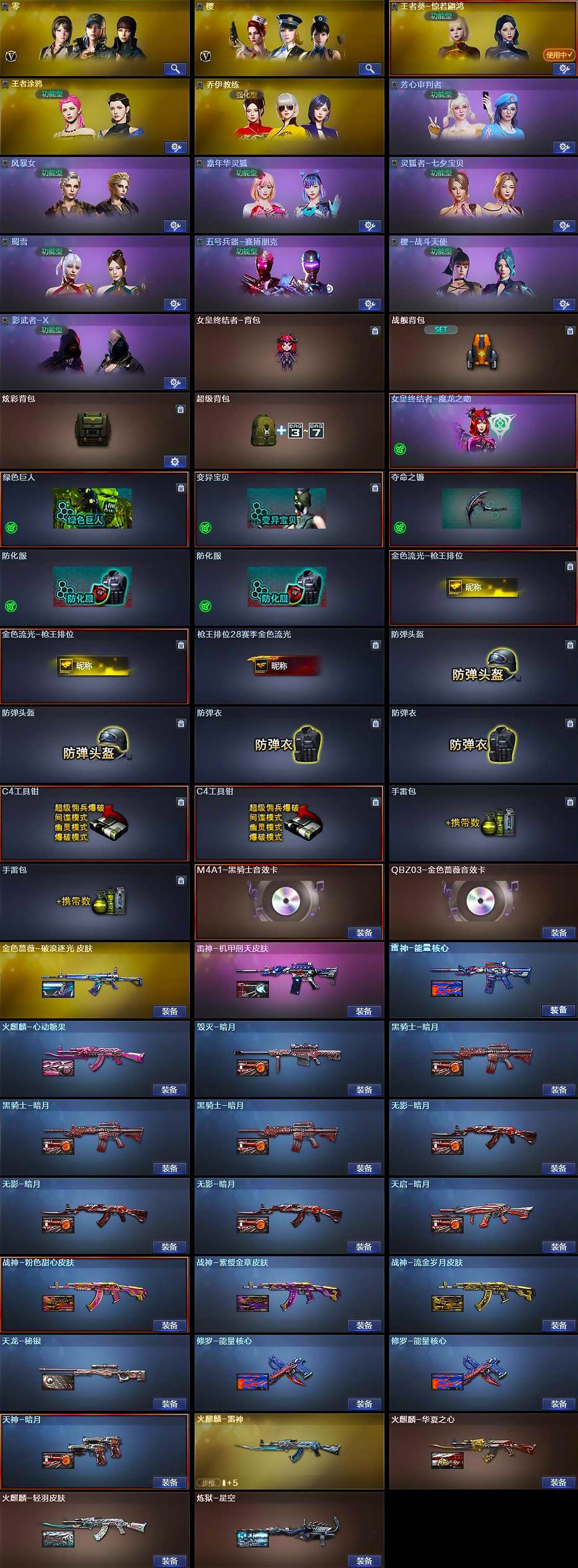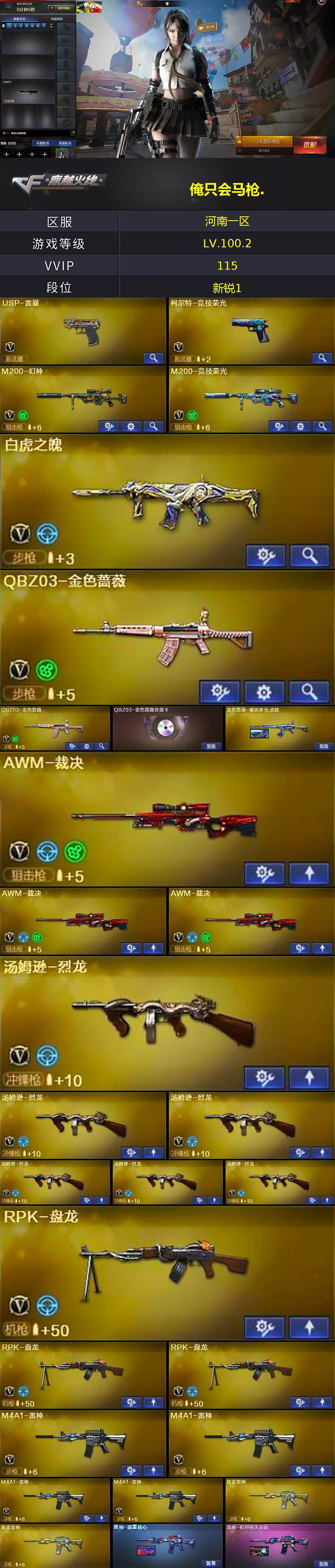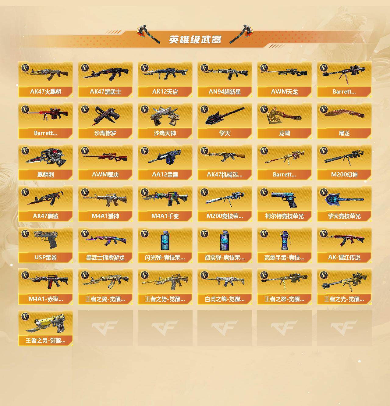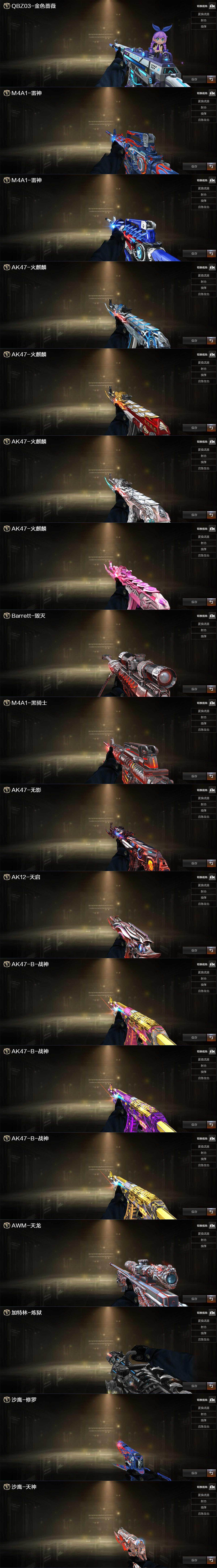 【热门武器】:QBZ03-金色蔷薇*2,M4A1-青龙,M200-幻神,M200-竞技荣光,毒蜂,牛牛-AK47,M4A1-黑骑士*2,汤姆逊-烈龙*6,RPK-盘龙*3,加特林-炼狱*3,USP-雷暴,沙鹰-修罗*9,金刚伞