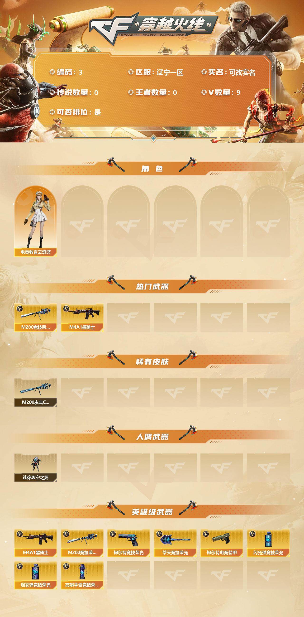 【商品标题】:辽宁一区-9V-0王者-0炫金【角色】:电竞教官-云悠悠【热