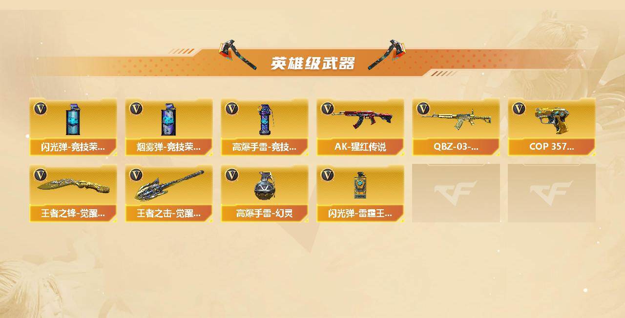 【热门武器】:M200-幻神,M200-竞技荣光,金色小号,M4A1-黑骑士*2,汤姆逊-烈龙*6,RPK-盘龙*6,加特林-炼狱,USP-雷暴,沙鹰-修罗,金刚伞
