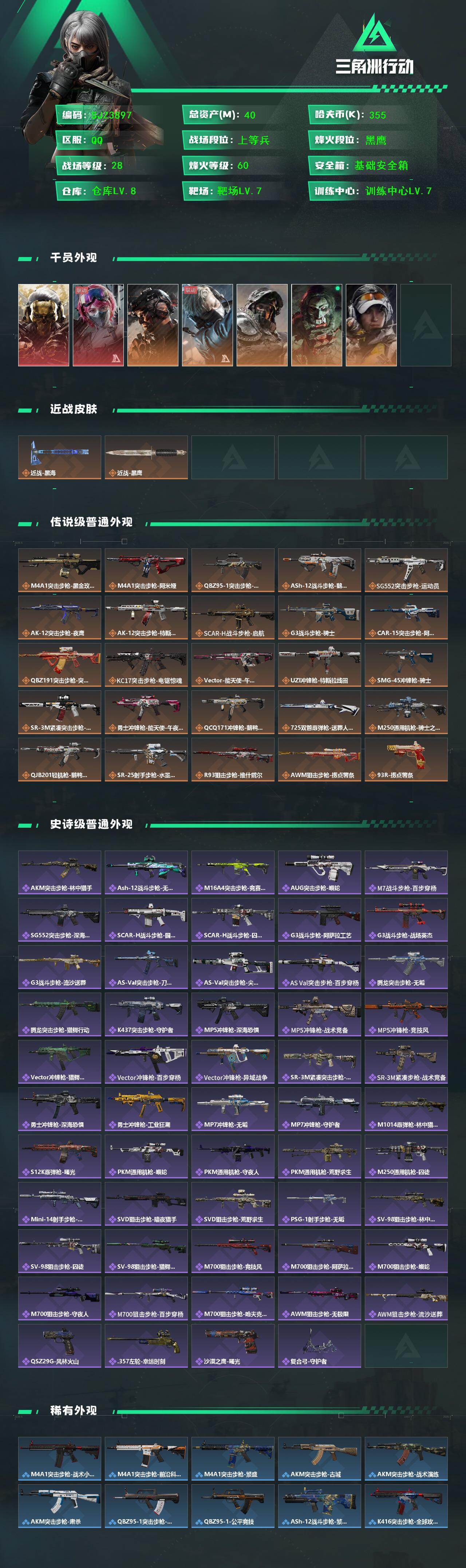 【SJZ3897】总资产(M):40M/哈夫币(K):355K/哈夫币(K):355K/传说枪皮数:25/全面战场等级:28_段位:上等兵/烽火地带等级:60_段位:黑鹰/红狼-蚀金玫瑰/蛊-能天使午夜邮差/威龙-铁面判官/蜂医-送葬人·无题密令/深蓝-不破誓约/红狼-电锯惊魂/露娜-金牌射手/近战-黑海/近战-黑鹰/M4A1突击步枪-蚀金玫瑰/M4A1突击步枪-阿米娅/QBZ95-1突击步枪-破军/ASh-12战斗步枪-鹅鸭杀/SG552突击步枪-运动员/AK-12突击步枪-夜鹰/AK-12突