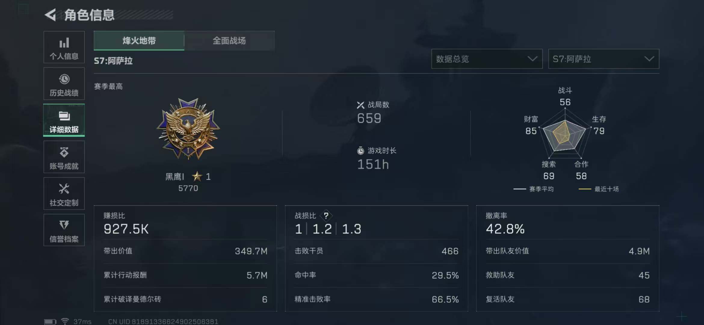 274m总资产-26065k哈伏币-60烽火等级-黑鹰-44战场等级-军士长