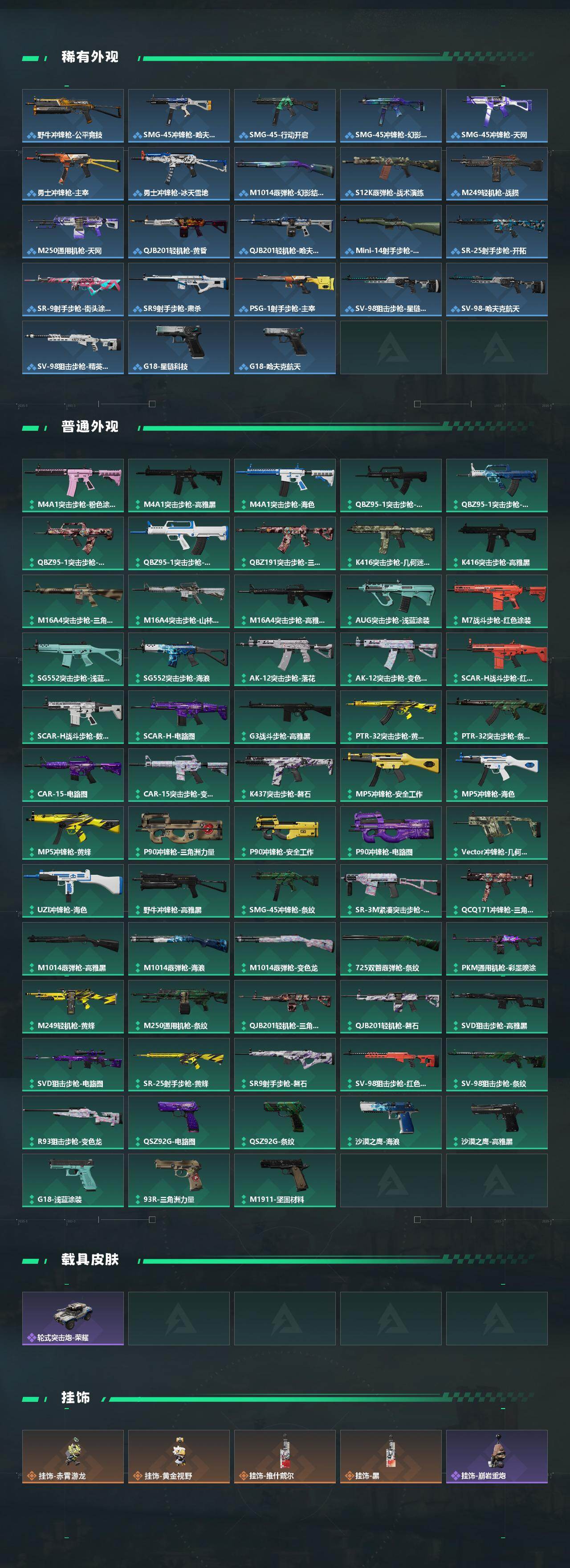 【传说外观】:M4A1突击步枪-阿米娅,ASh-12战斗步枪-鹅鸭杀,SG552突击步枪-运动员,AK-12突击步枪-特斯拉线圈,SCAR-H战斗步枪-启航,G3