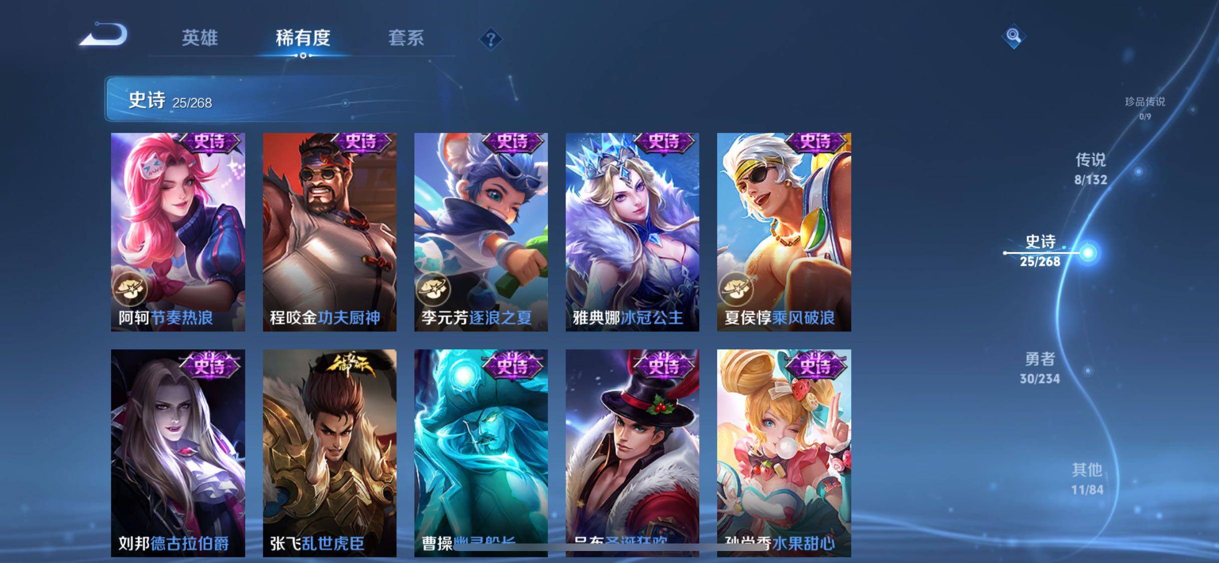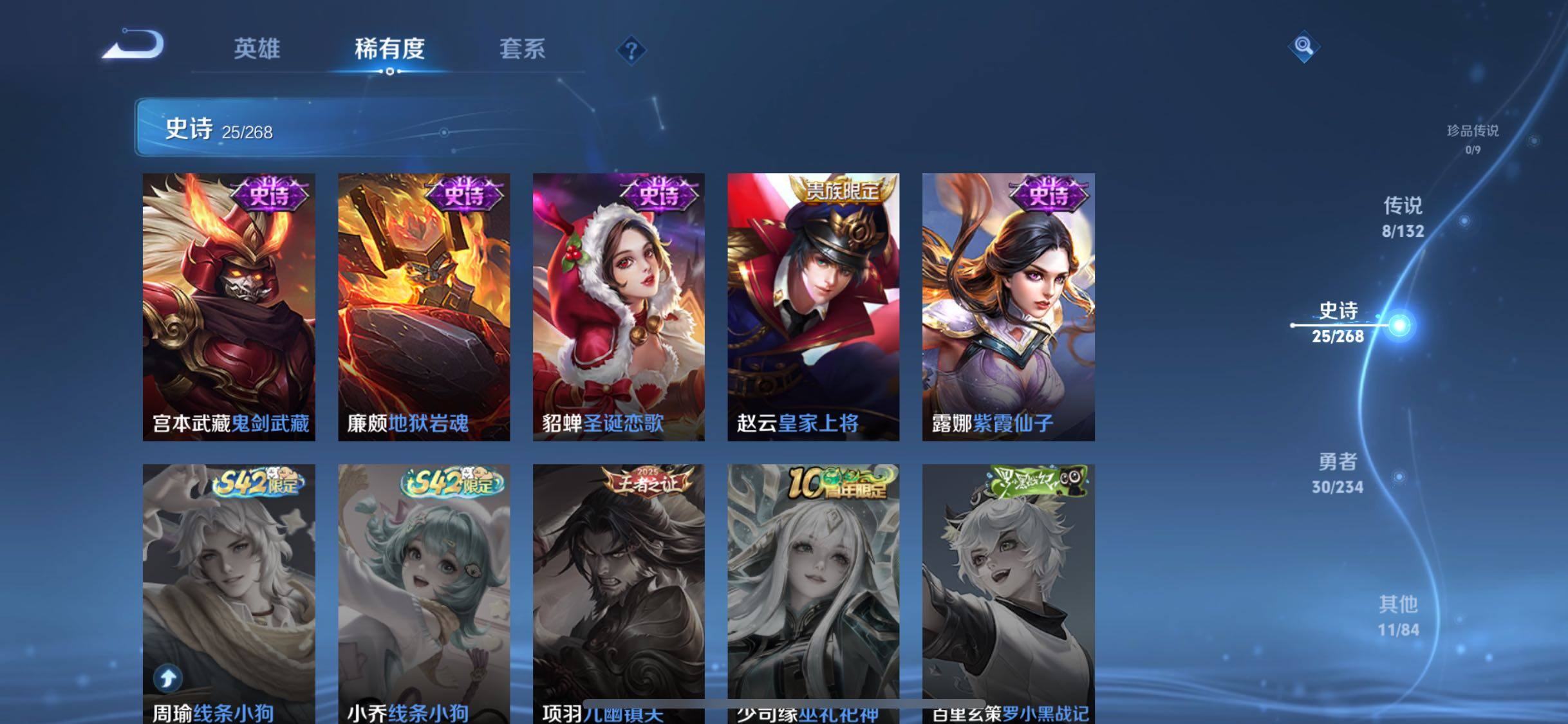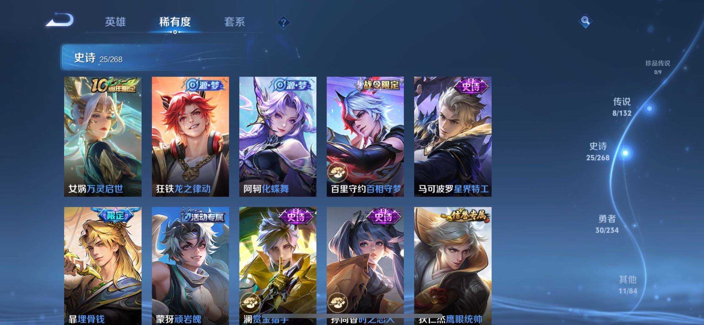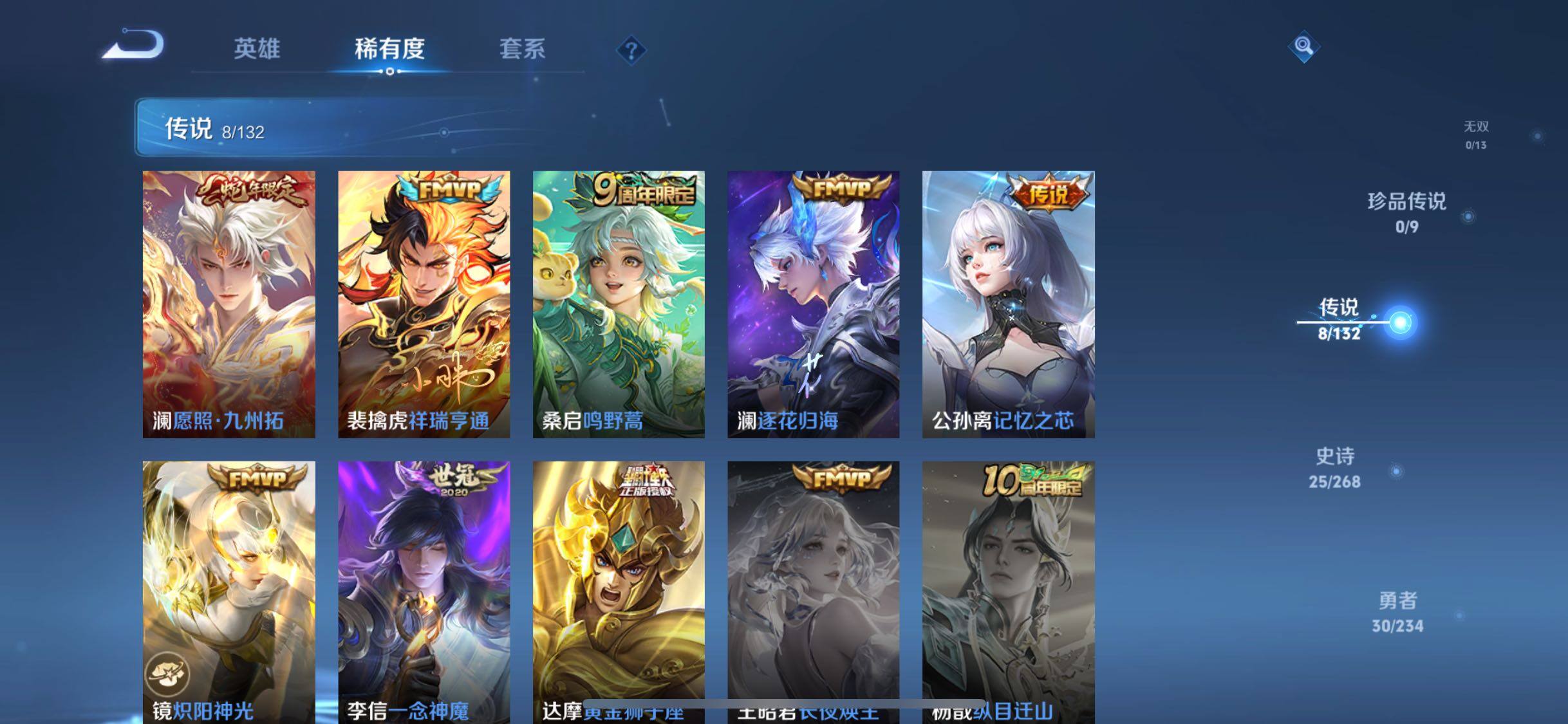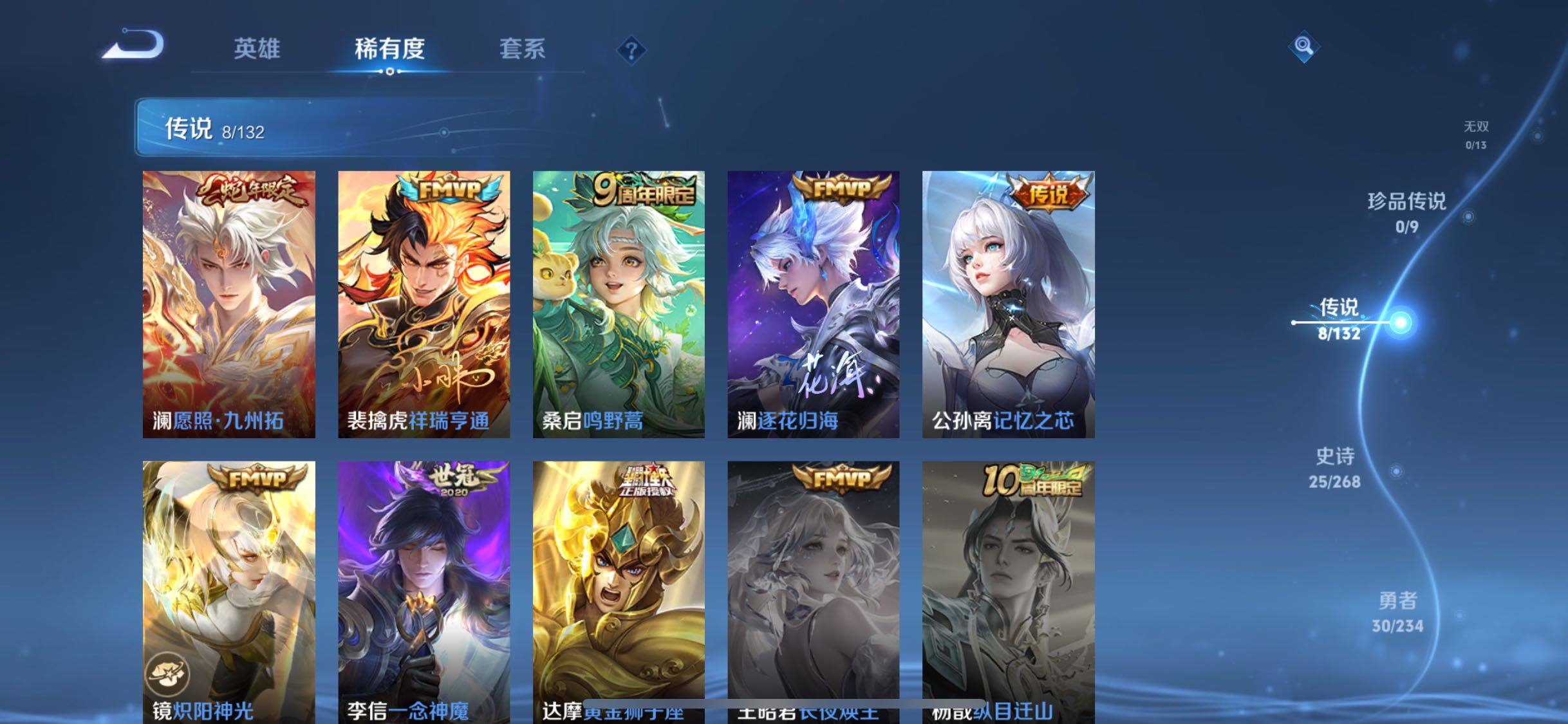 【传说皮肤】:澜愿照九州拓,裴擒虎祥瑞亨通,桑启鸣野蒿,澜逐花归海,公孙离记忆之芯,镜炽阳神光,李信一念神魔,达摩黄金狮子座