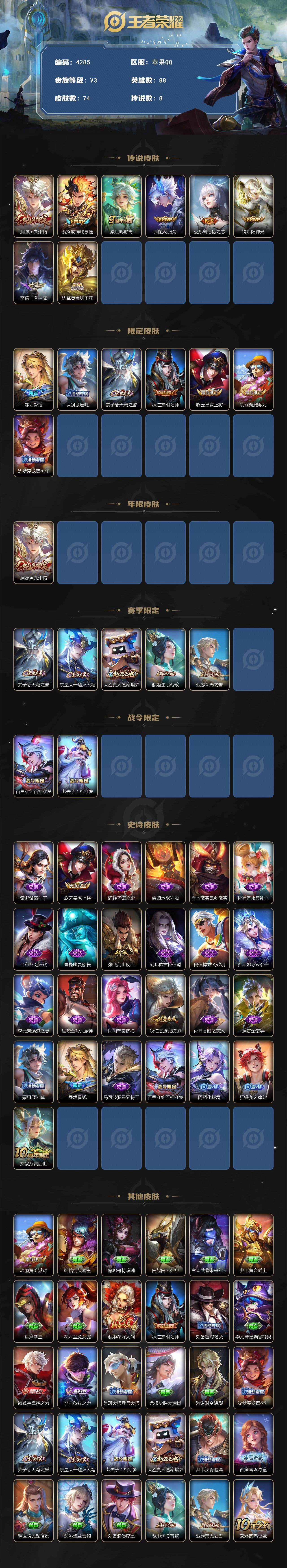 苹果Q-V3-永恒钻石III段位-88英雄-74皮肤-8传说-25史诗【传说