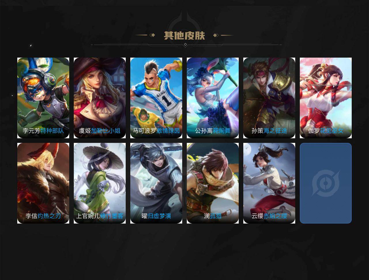【限定皮肤】:暃埋骨钱,蒙犽顽岩魄,姜子牙天穹之誓,狄仁杰阴阳师,赵云皇家上将,项羽海滩派对,沈梦溪龙舞盛年