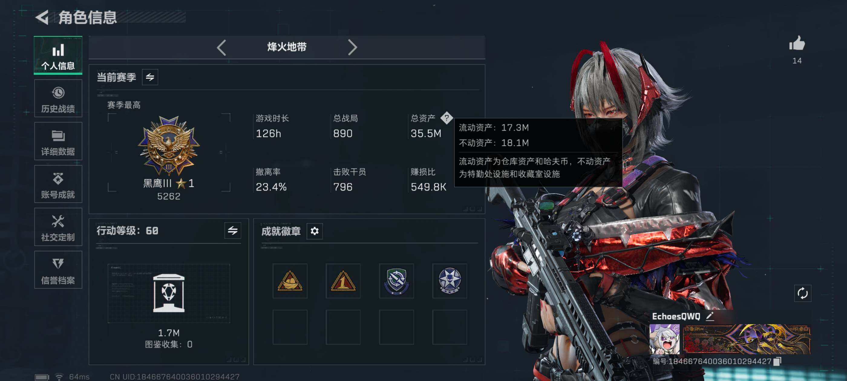 LJ4739总资产35.5M哈弗币409K近战武器-怜悯,近战武器-信条,近战武器-电锯惊魂,近战武器-黑鹰骇爪维什戴尔无无AW子弹0发三角币22仓库LV.7高级安全箱靶场LV.2训练中心LV.3无,骇爪-维什戴尔,近战-怜悯,近战-信条,近战-电锯惊魂,近战-黑鹰