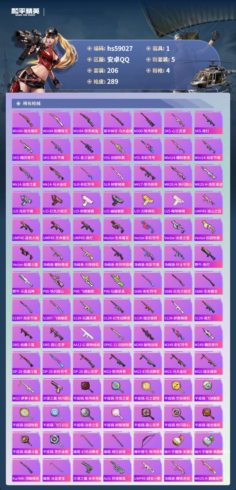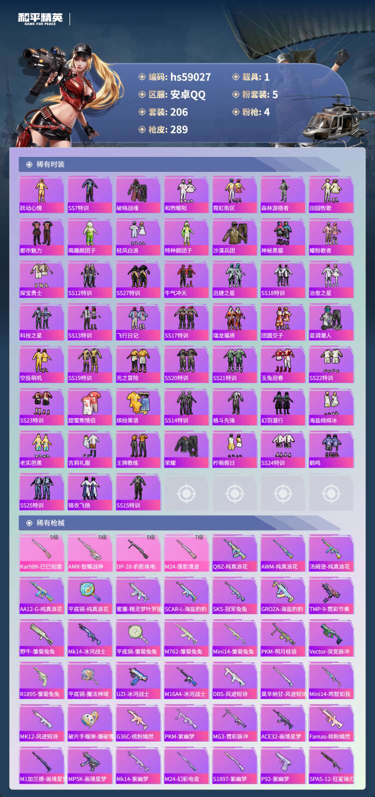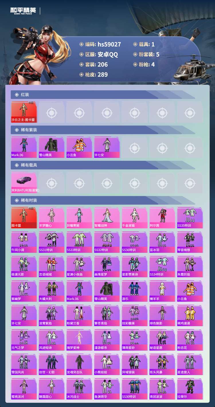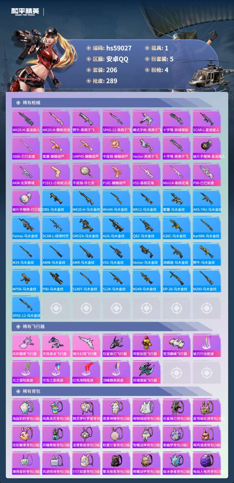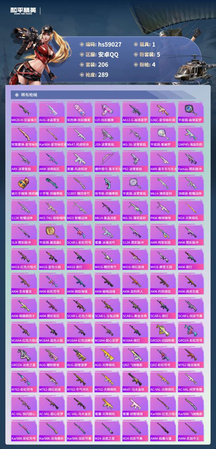 hs59027 安卓手Q-17王牌印记-1红装-5粉装-4特效枪-1载具-91613热力值-206套