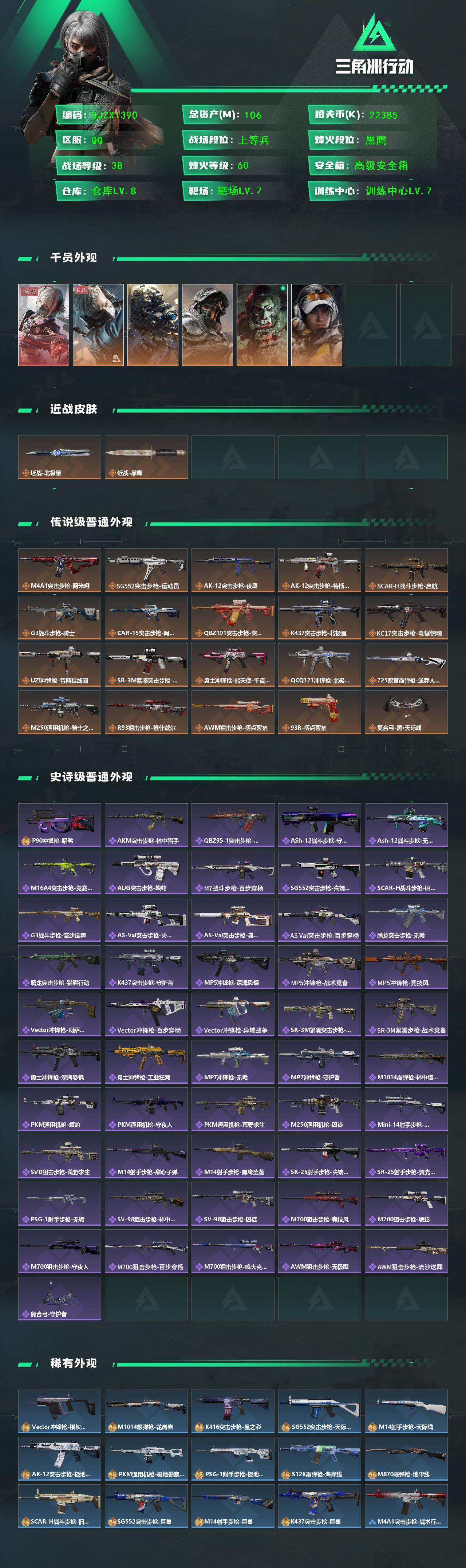 【SJZX1390】总资产(M):106M/哈夫币(K):22385K/哈夫币(K):22385K/传说枪皮数:20/全面战场等级:38_段位:上等兵/烽火地带等级:60_段位:黑鹰/骇爪-维什戴尔/蜂医-送葬人·无题密令/无名-夜鹰/深蓝-不破誓约/红狼-电锯惊魂/露娜-金牌射手/近战-北极星/近战-黑鹰/M4A1突击步枪-阿米娅/SG552突击步枪-运动员/AK-12突击步枪-夜鹰/AK-12突击步枪-特斯拉线圈/SCAR-H战斗步枪-启航/G3战斗步枪-骑士/CAR-15突击步枪-阿米娅/