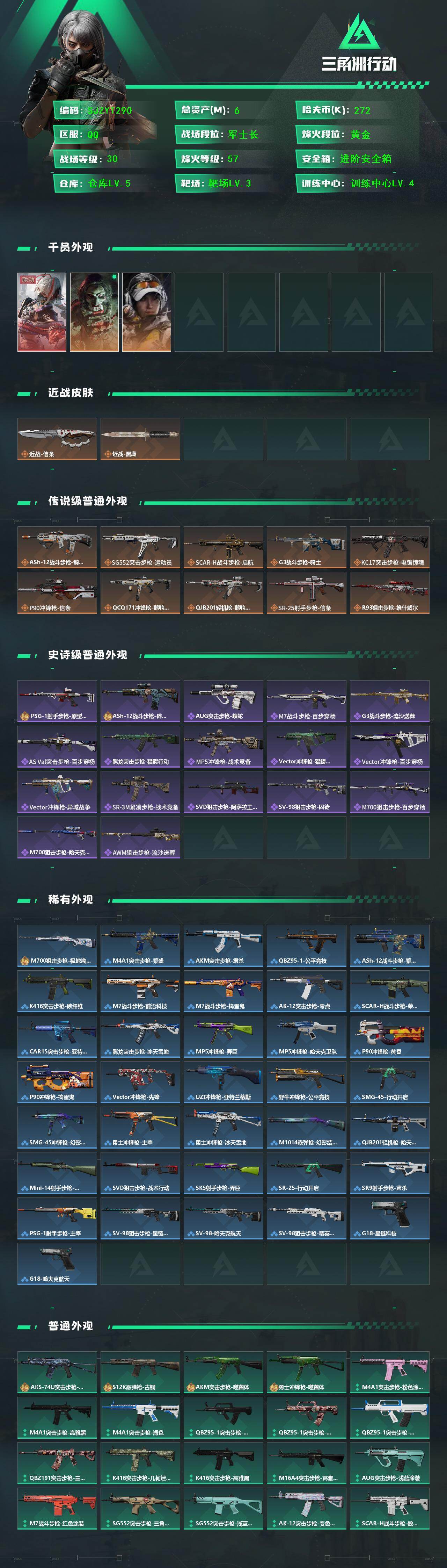 【SJZYT290】总资产(M):6M/哈夫币(K):272K/哈夫币(K):272K/传说枪皮数:10/全面战场等级:30_段位:军士长/烽火地带等级:57_段位:黄金/骇爪-维什戴尔/红狼-电锯惊魂/露娜-金牌射手/近战-信条/近战-黑鹰/ASh-12战斗步枪-鹅鸭杀/SG552突击步枪-运动员/SCAR-H战斗步枪-启航/G3战斗步枪-骑士/KC17突击步枪-电锯惊魂/P90冲锋枪-信条/QCQ171冲锋枪-鹅鸭杀/QJB201轻机枪-鹅鸭杀/SR-25射手步枪-信条/R93狙击步枪-维什