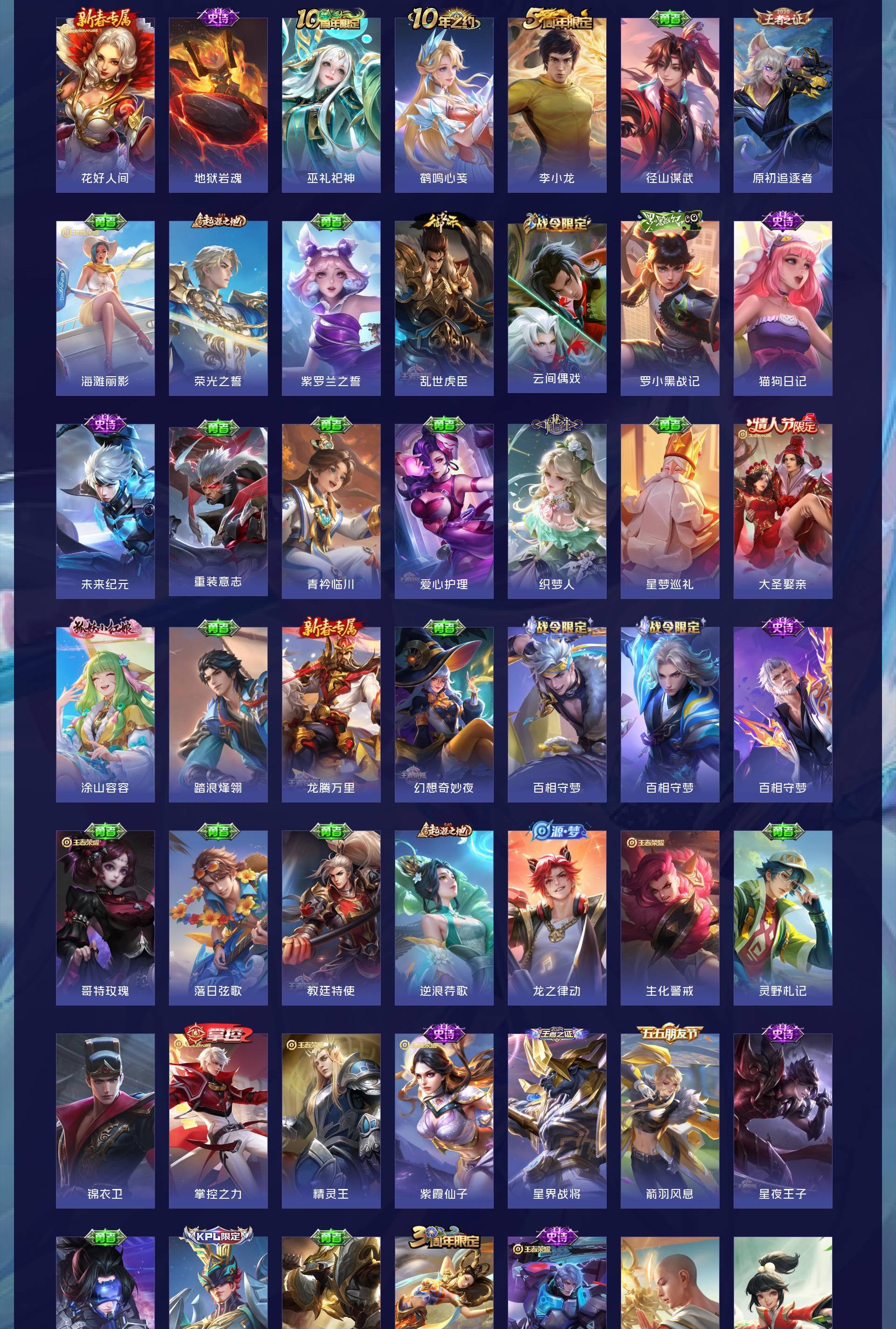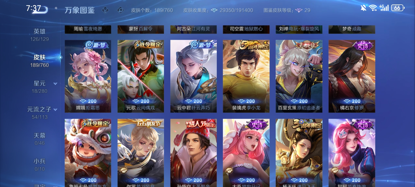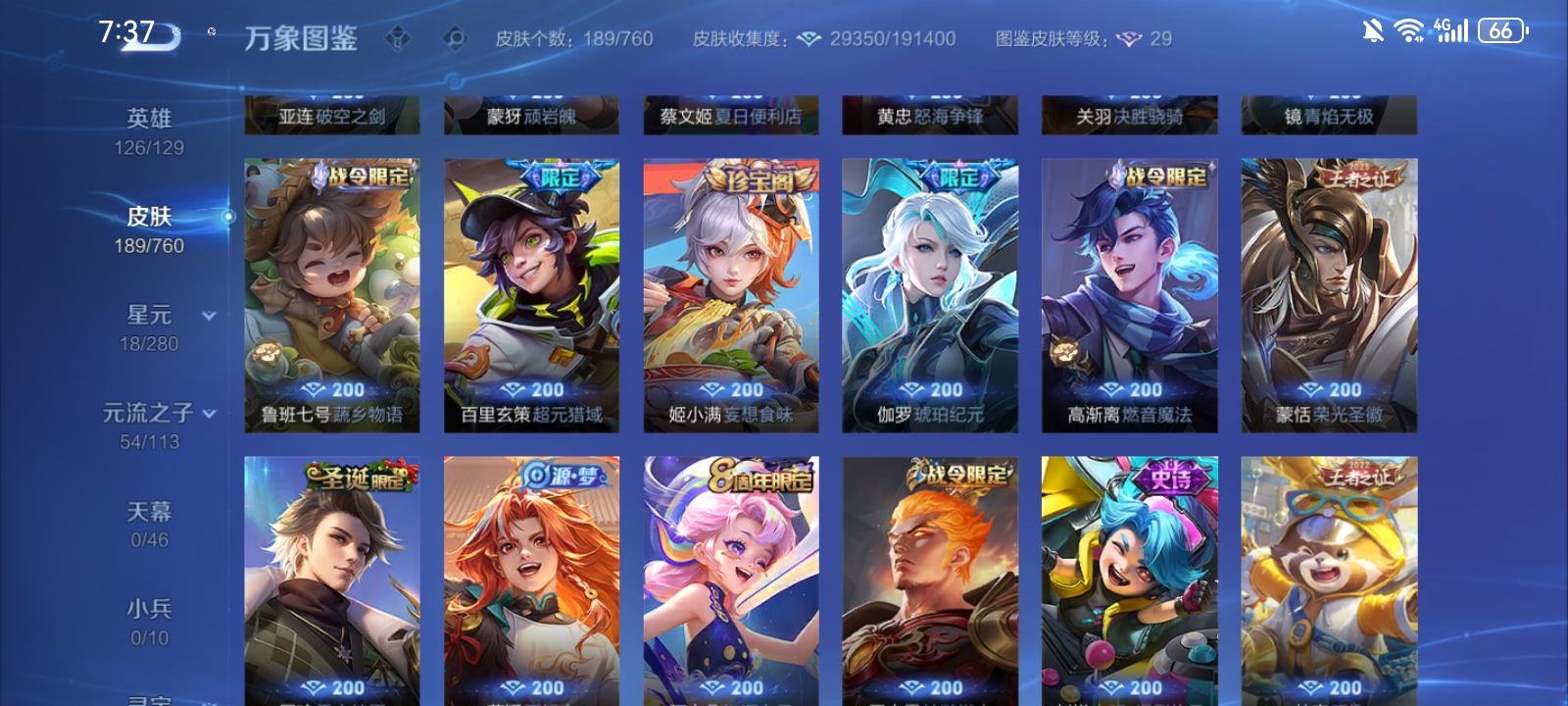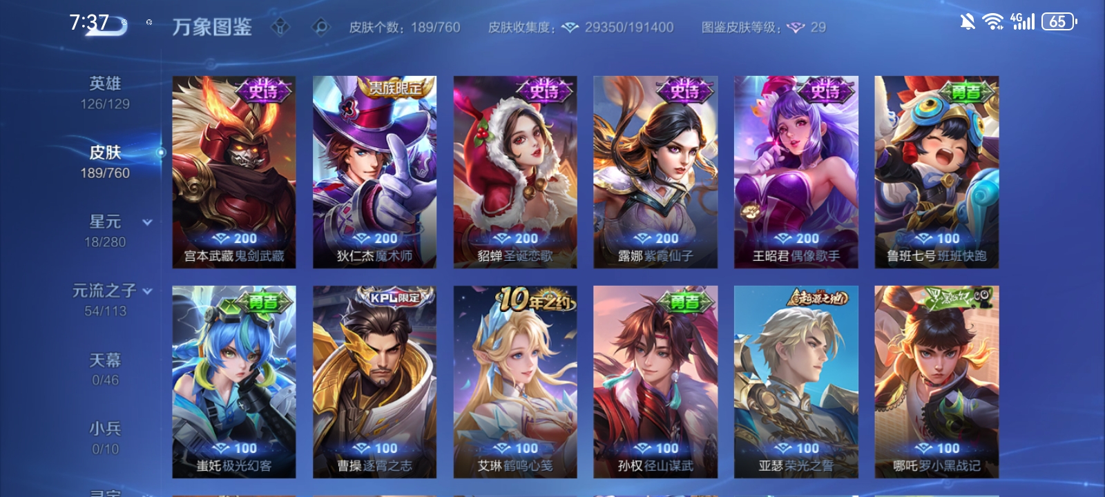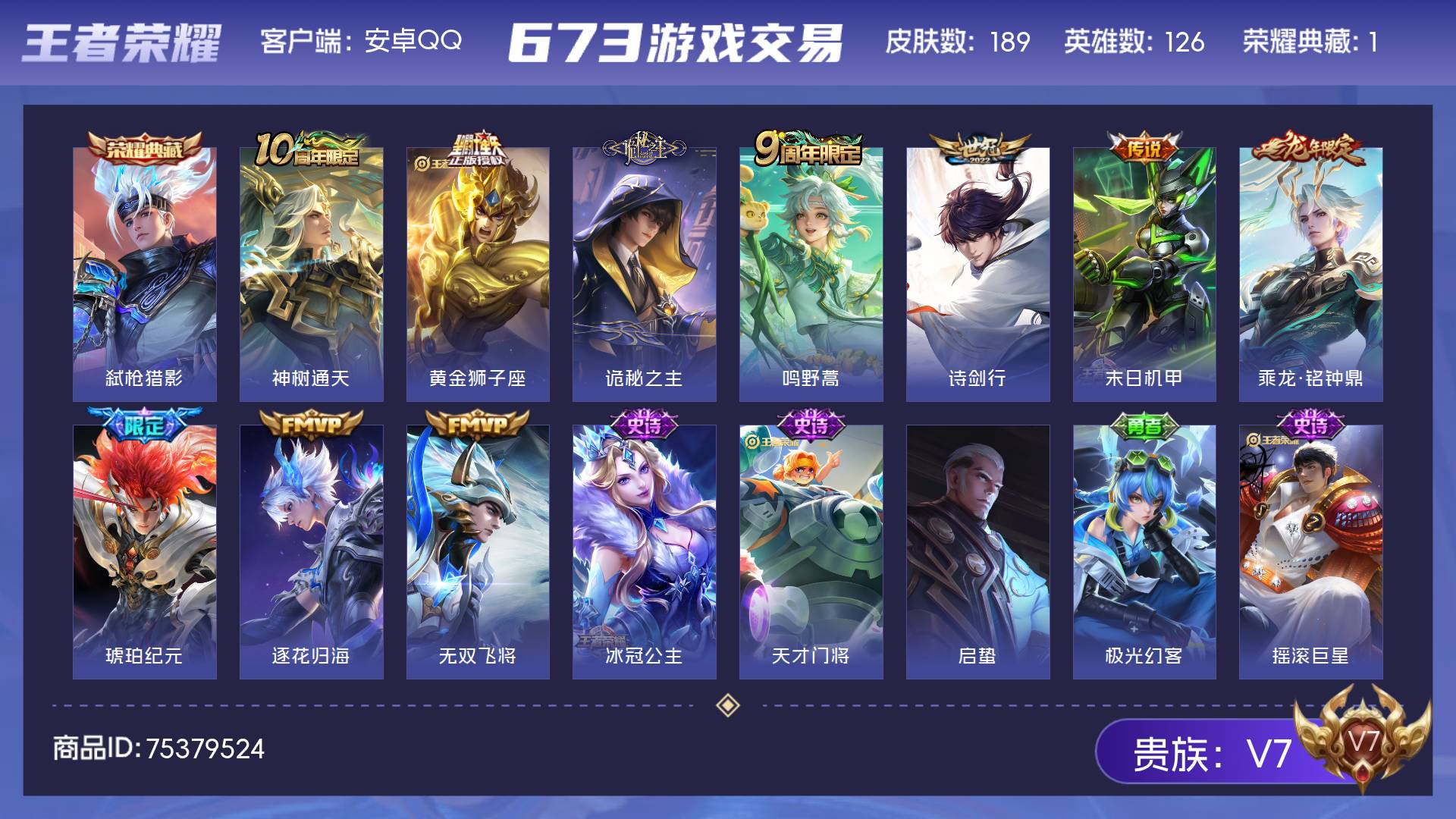 V7 皮肤189 英雄126 至尊星耀 荣耀典藏1 传说10 其他皮肤182