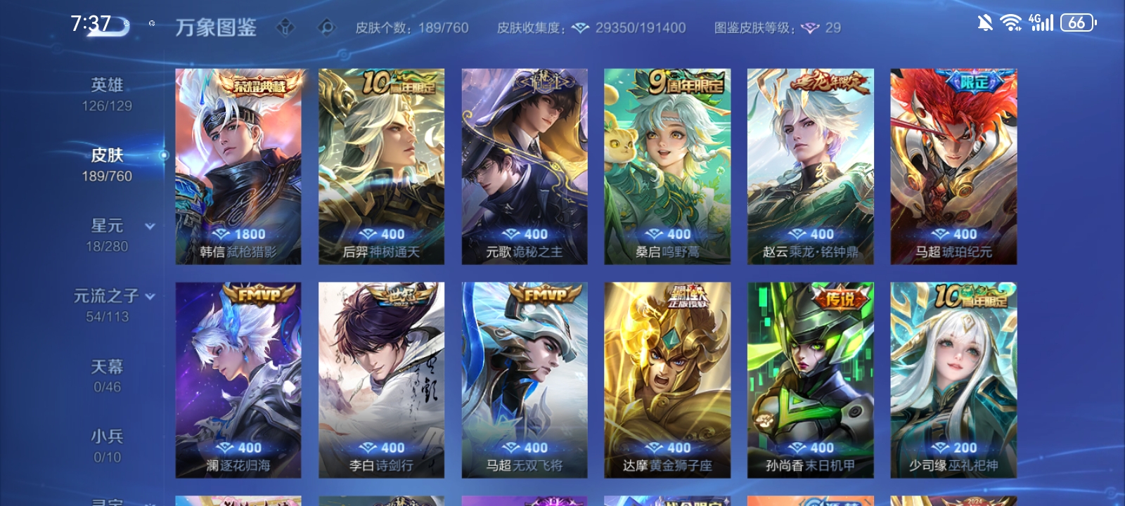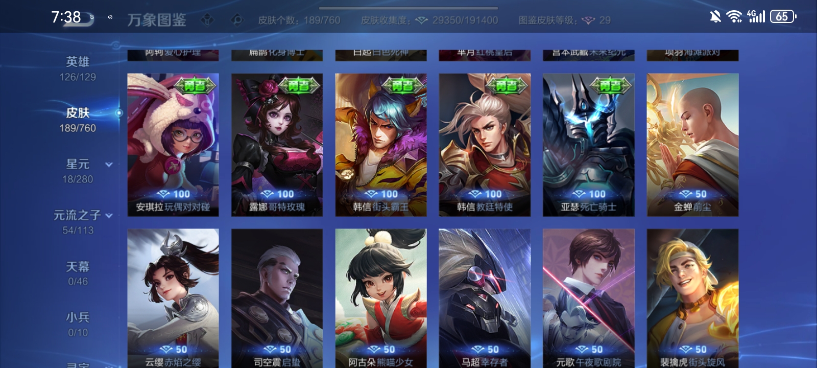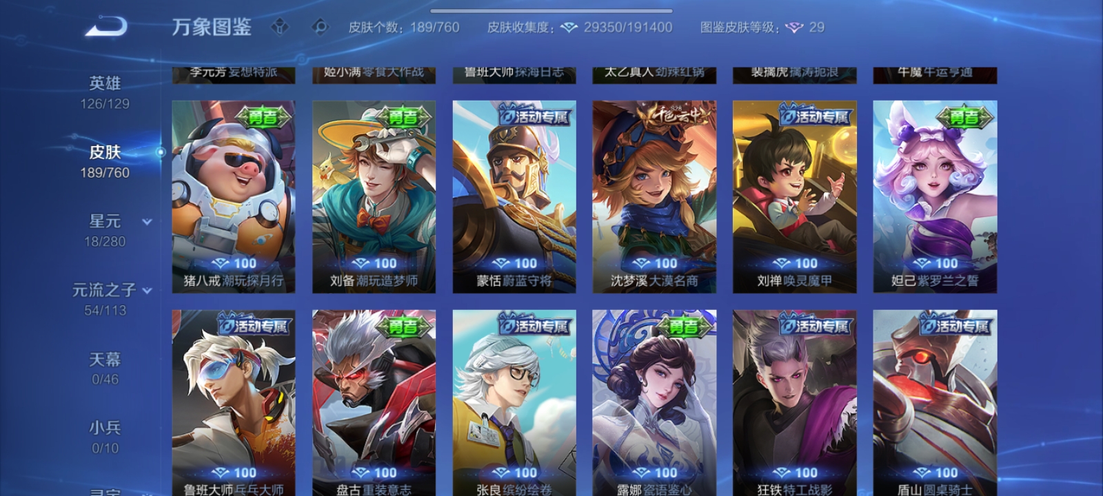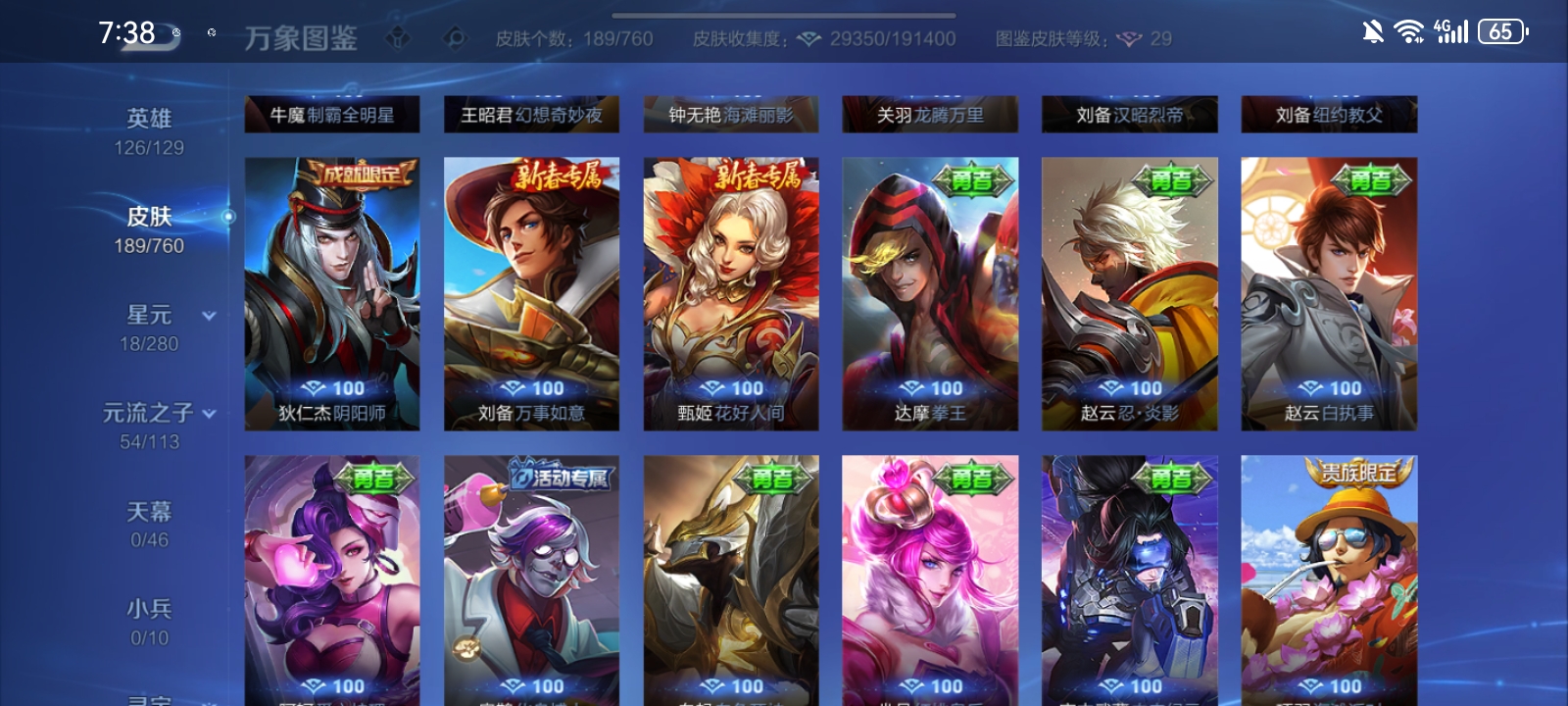 V7 皮肤189 英雄126 至尊星耀 荣耀典藏1 传说10 其他皮肤182