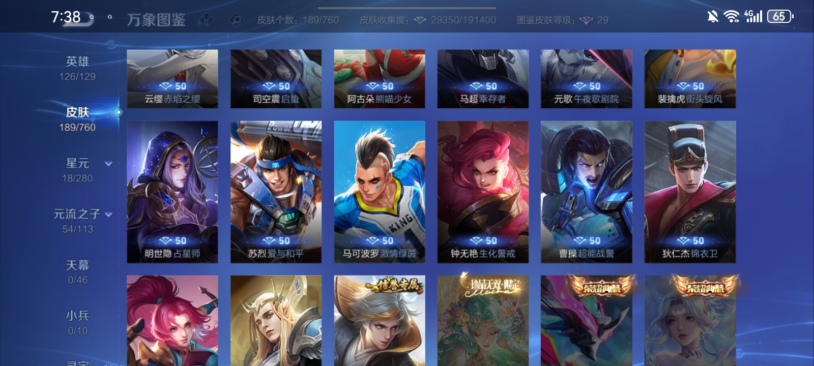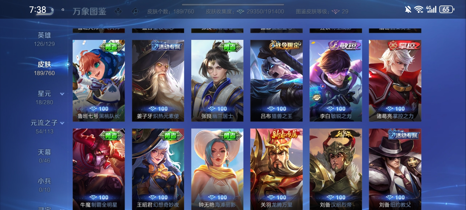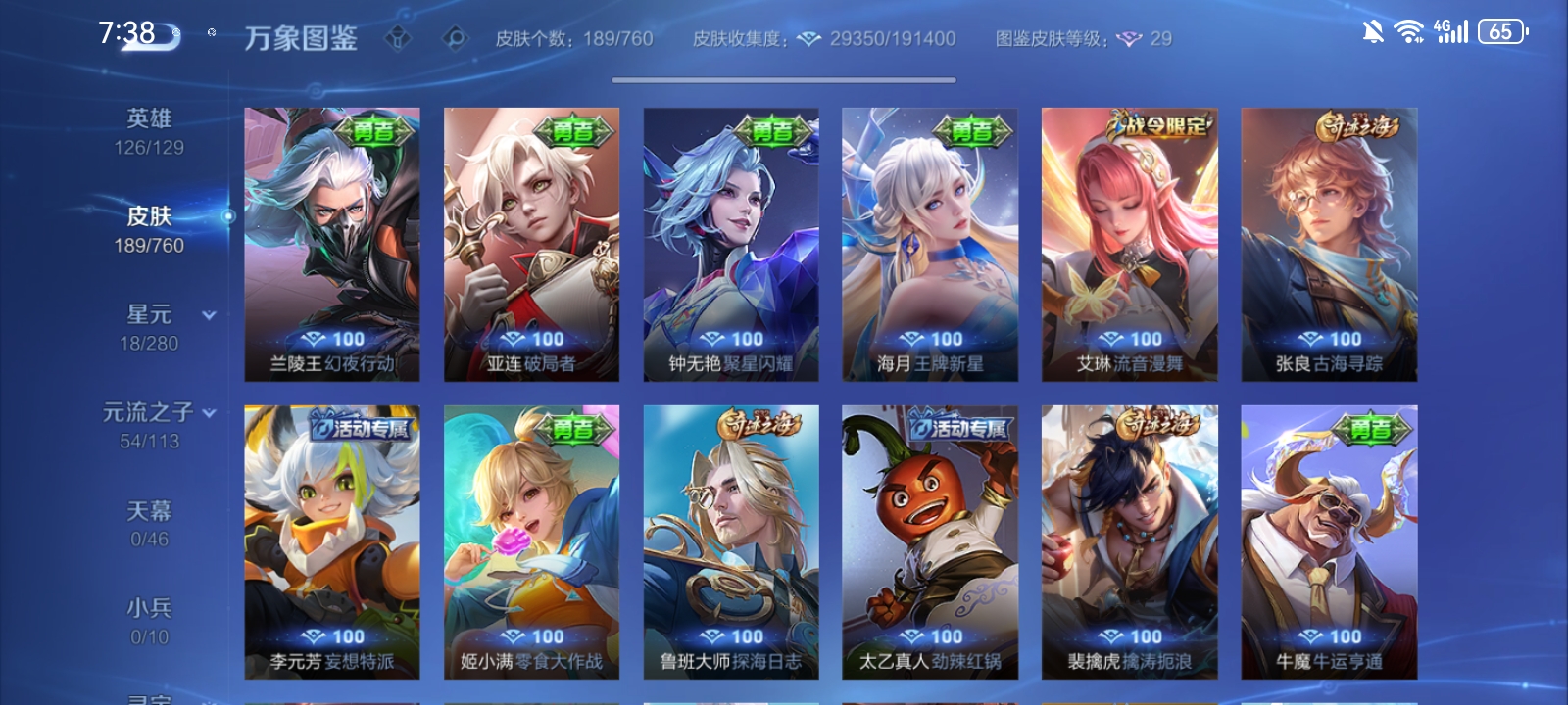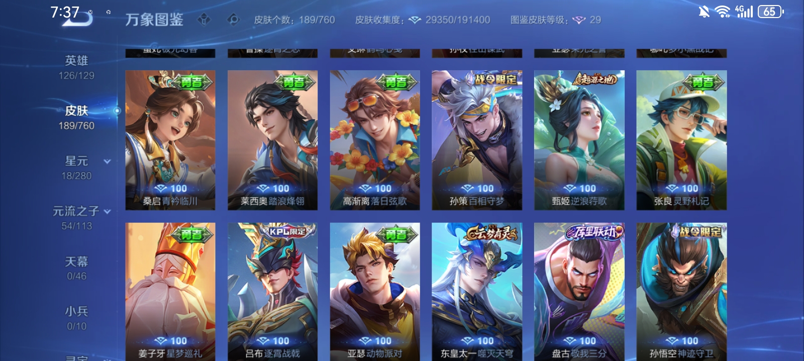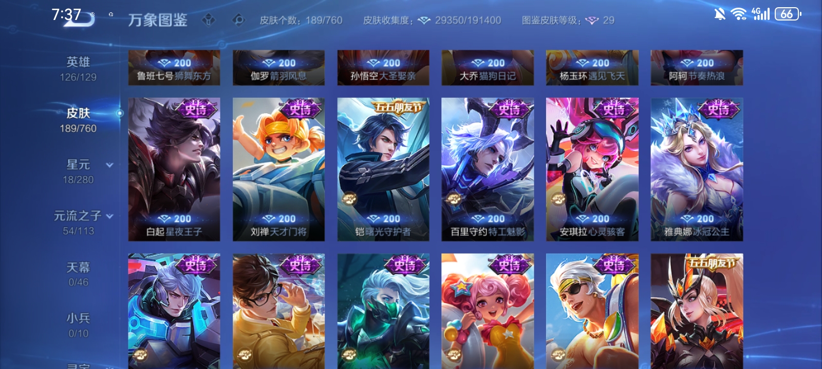 V7 皮肤189 英雄126 至尊星耀 荣耀典藏1 传说10 其他皮肤182