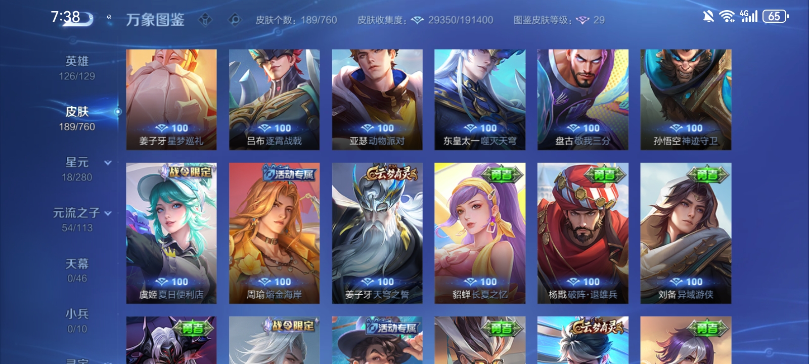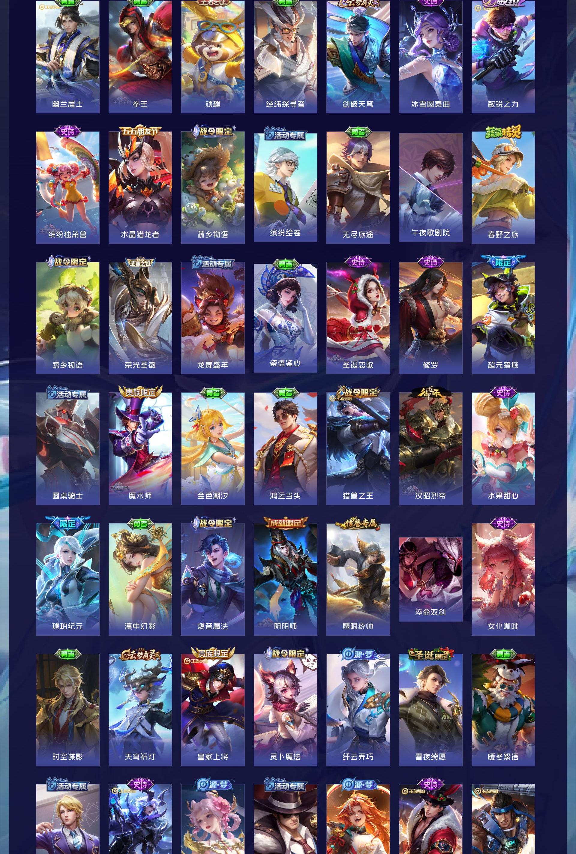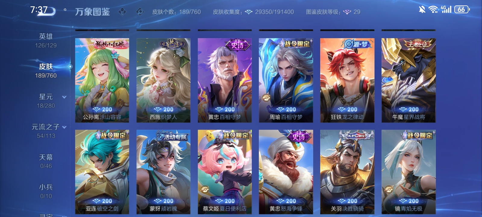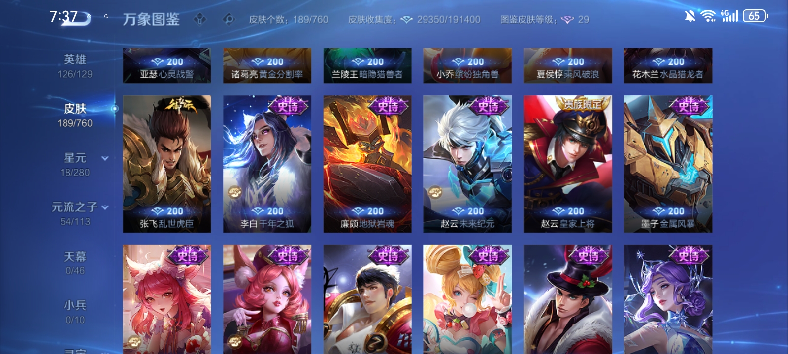 V7 皮肤189 英雄126 至尊星耀 荣耀典藏1 传说10 其他皮肤182