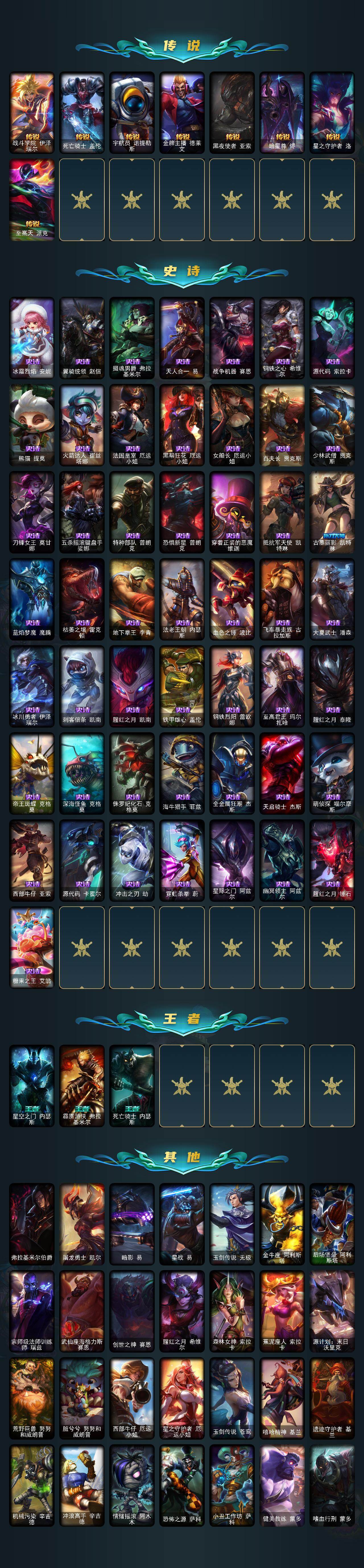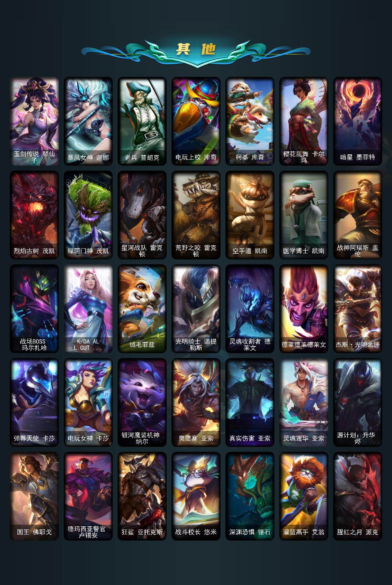 【至臻皮肤】:至臻魅惑女巫厄运小姐,至臻女帝黛安娜,至臻KDA卡莎,至臻真实伤害赛娜,至臻未来战士卢锡安,至臻真实伤害奇亚娜,至臻斗魂觉醒派克,至臻神龙尊者炎龙瑟提