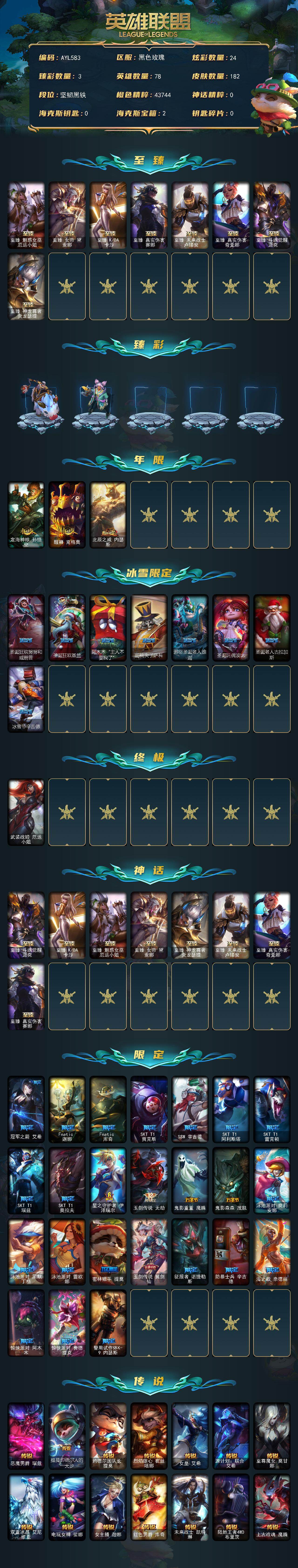 【店主推荐捡漏号】未定级段位-78英雄-182皮肤-24炫彩-1终极-8神话-35限定-22传说-50史诗