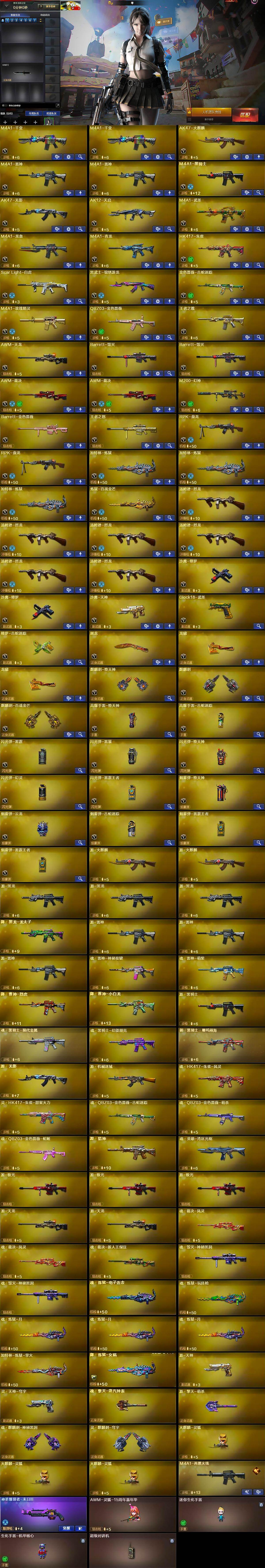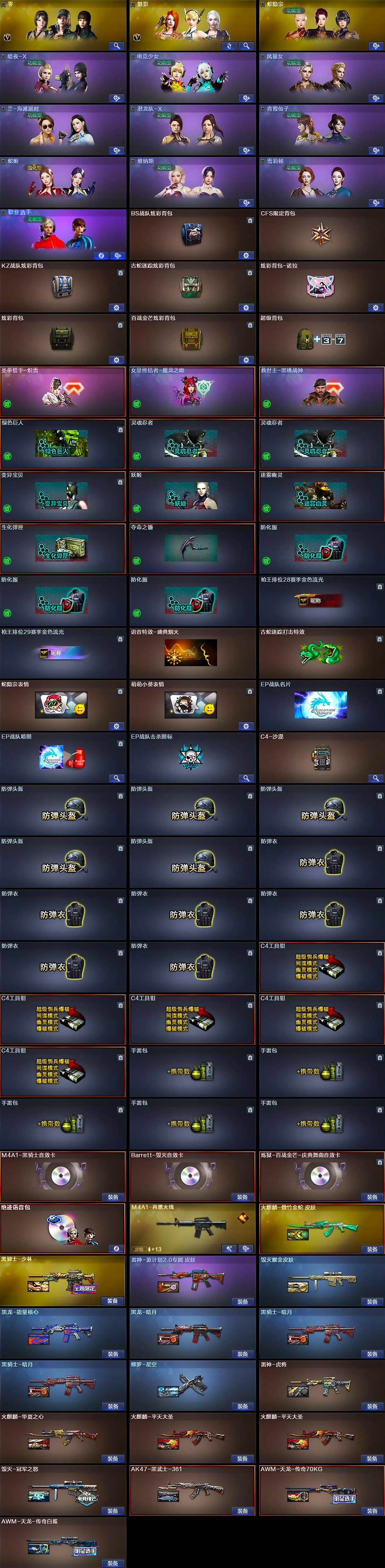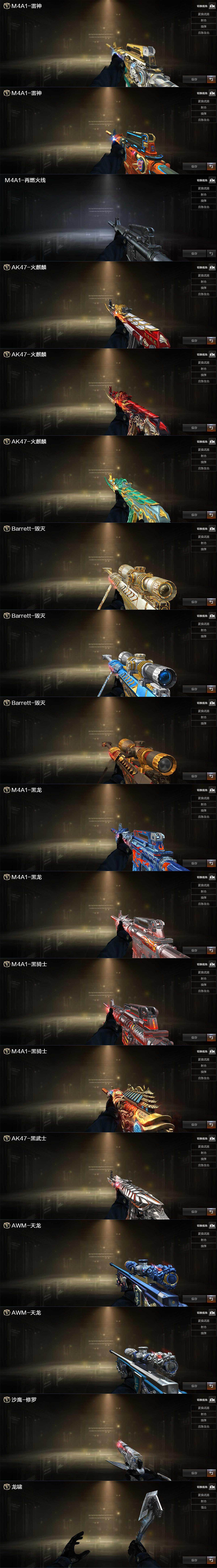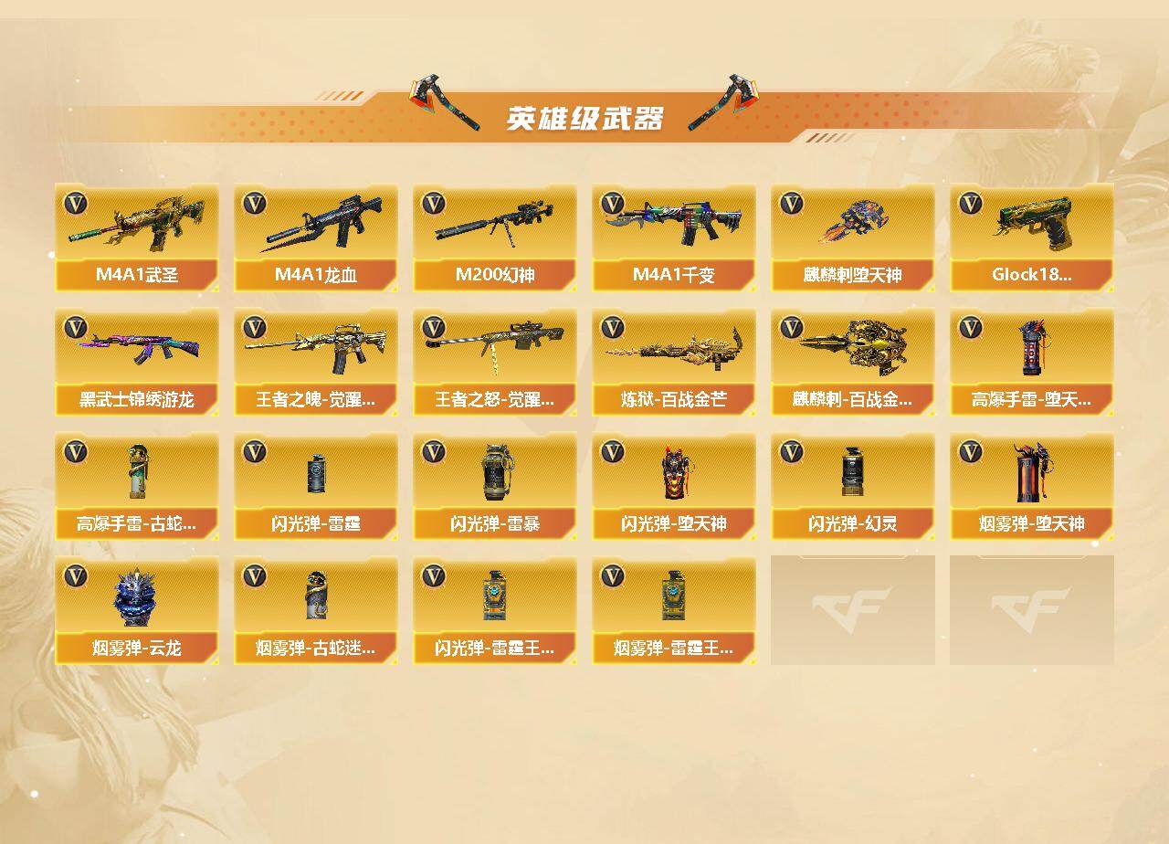 【热门武器】:QBZ03-金色蔷薇,Scar Light-白虎,HK417-朱雀,M4A1-青龙,M200-幻神,金色蔷薇-古蛇迷踪,修罗-古蛇迷踪,M4A1-黑骑士,汤姆逊-烈龙*6,RPK-盘龙*2,加特林-炼狱*3,羊驼玩偶,沙鹰-修罗*2