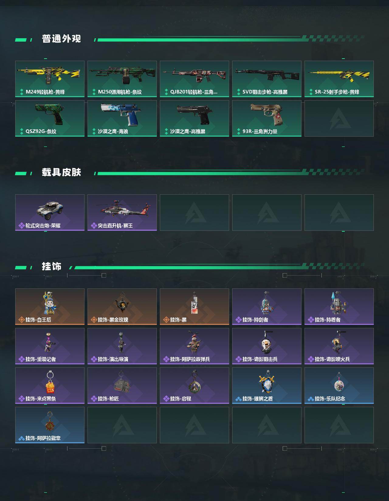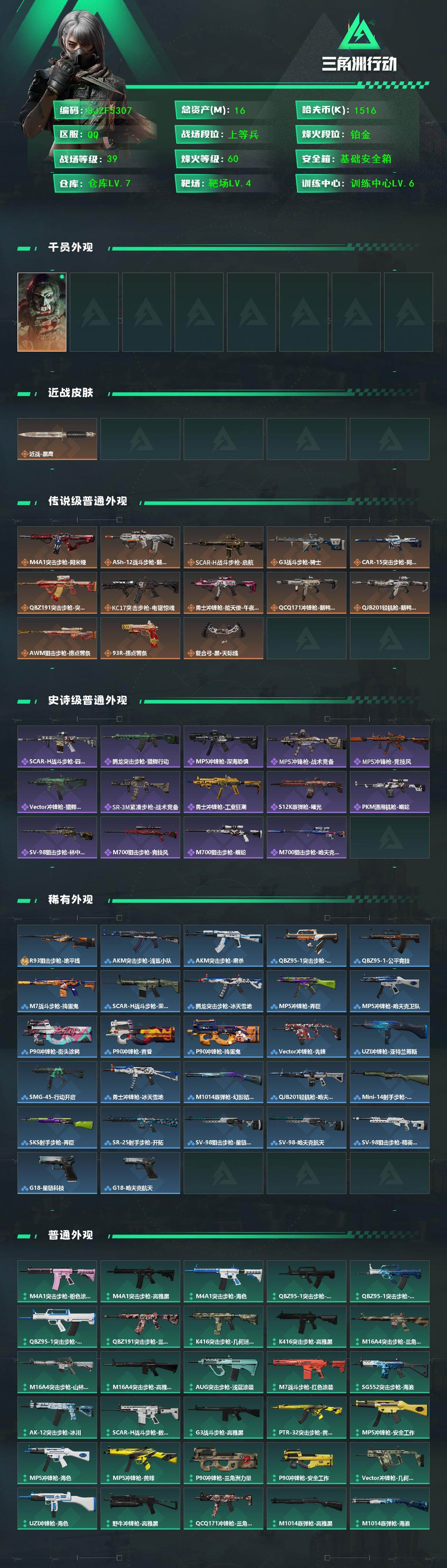 【SJZF5307】总资产(M):16M/哈夫币(K):1516K/哈夫币(K):1516K/传说枪皮数:13/全面战场等级:39_段位:上等兵/烽火地带等级:60_段位:铂金/红狼-电锯惊魂/近战-黑鹰/M4A1突击步枪-阿米娅/ASh-12战斗步枪-鹅鸭杀/SCAR-H战斗步枪-启航/G3战斗步枪-骑士/CAR-15突击步枪-阿米娅/腾龙突击步枪-捞点薯条/KC17突击步枪-电锯惊魂/勇士冲锋枪-能天使-午夜邮差/QCQ171冲锋枪-鹅鸭杀/QJB201轻机枪-鹅鸭杀/AWM狙击步枪-捞点薯