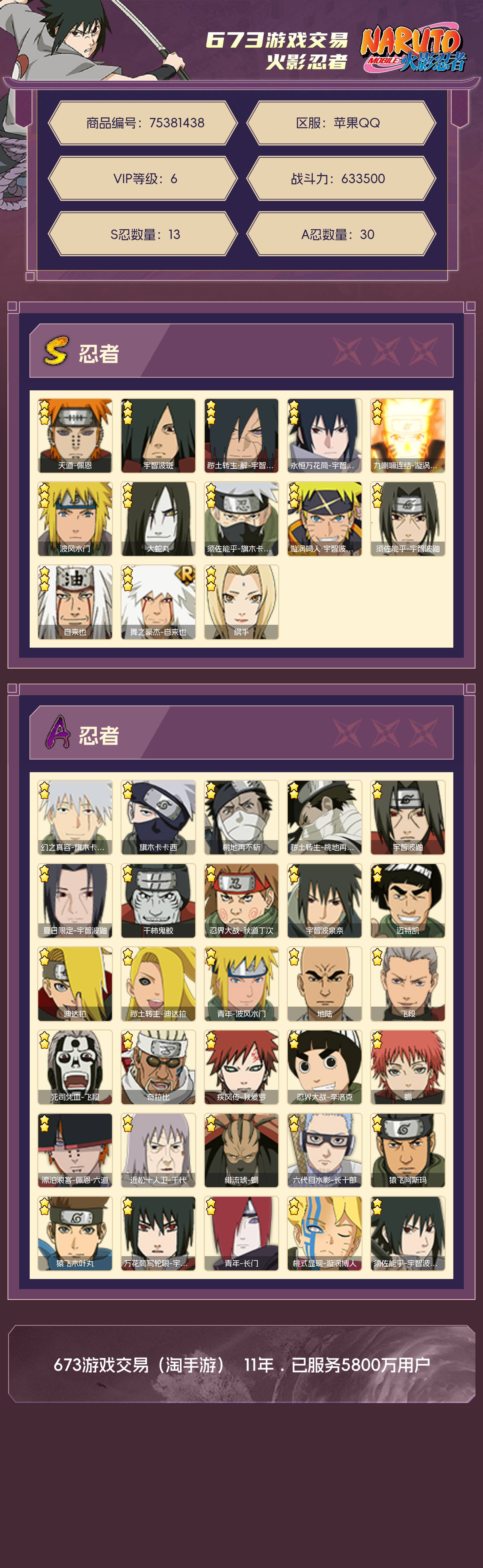 角色等级142 金币8000 战斗力633500 S忍13 A忍30 6 段位暗部