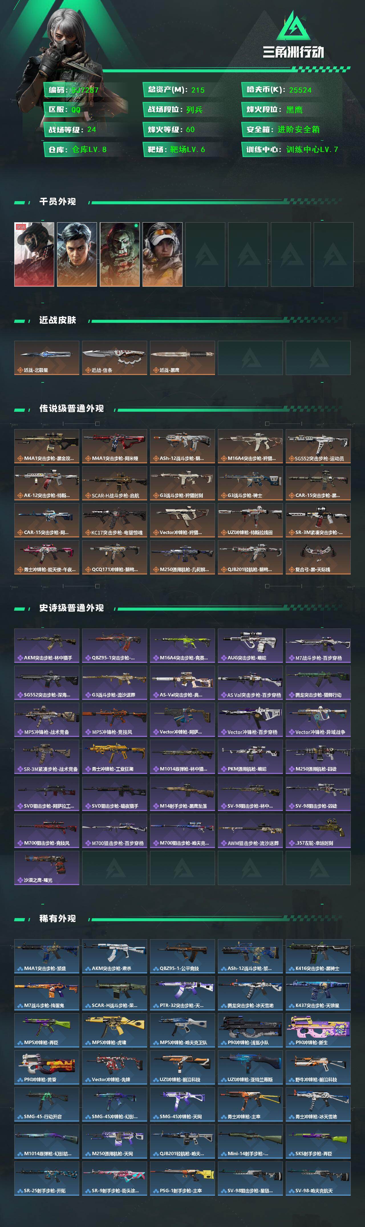 【SJ7287】总资产(M):215M/哈夫币(K):25524K/哈夫币(K):25524K/传说枪皮数:20/全面战场等级:24_段位:列兵/烽火地带等级:60_段位:黑鹰/露娜-黑·天际线/威龙-飞虎/红狼-电锯惊魂/露娜-金牌射手/近战-北极星/近战-信条/近战-黑鹰/M4A1突击步枪-蚀金玫瑰/M4A1突击步枪-阿米娅/ASh-12战斗步枪-鹅鸭杀/M16A4突击步枪-狩猎时刻/SG552突击步枪-运动员/AK-12突击步枪-特斯拉线圈/SCAR-H战斗步枪-启航/G3战斗步枪-狩猎时