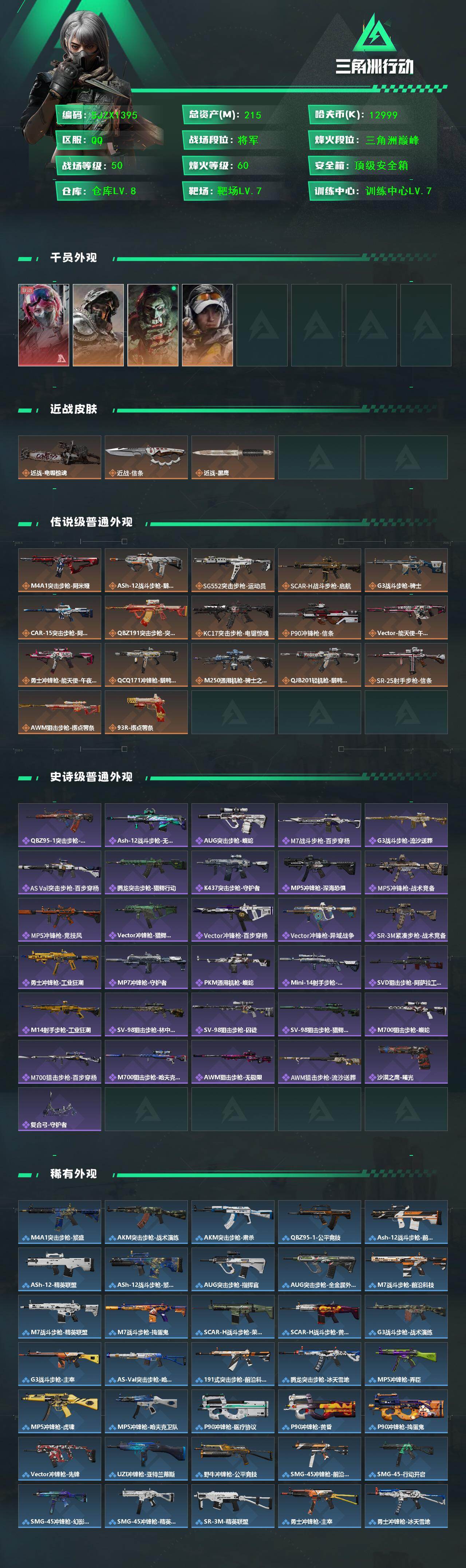 【SJZX1395】总资产(M):215M/哈夫币(K):12999K/哈夫币(K):12999K/传说枪皮数:17/全面战场等级:50_段位:将军/烽火地带等级:60_段位:三角洲巅峰/蛊-能天使午夜邮差/深蓝-不破誓约/红狼-电锯惊魂/露娜-金牌射手/近战-电锯惊魂/近战-信条/近战-黑鹰/M4A1突击步枪-阿米娅/ASh-12战斗步枪-鹅鸭杀/SG552突击步枪-运动员/SCAR-H战斗步枪-启航/G3战斗步枪-骑士/CAR-15突击步枪-阿米娅/腾龙突击步枪-捞点薯条/KC17突击步枪-