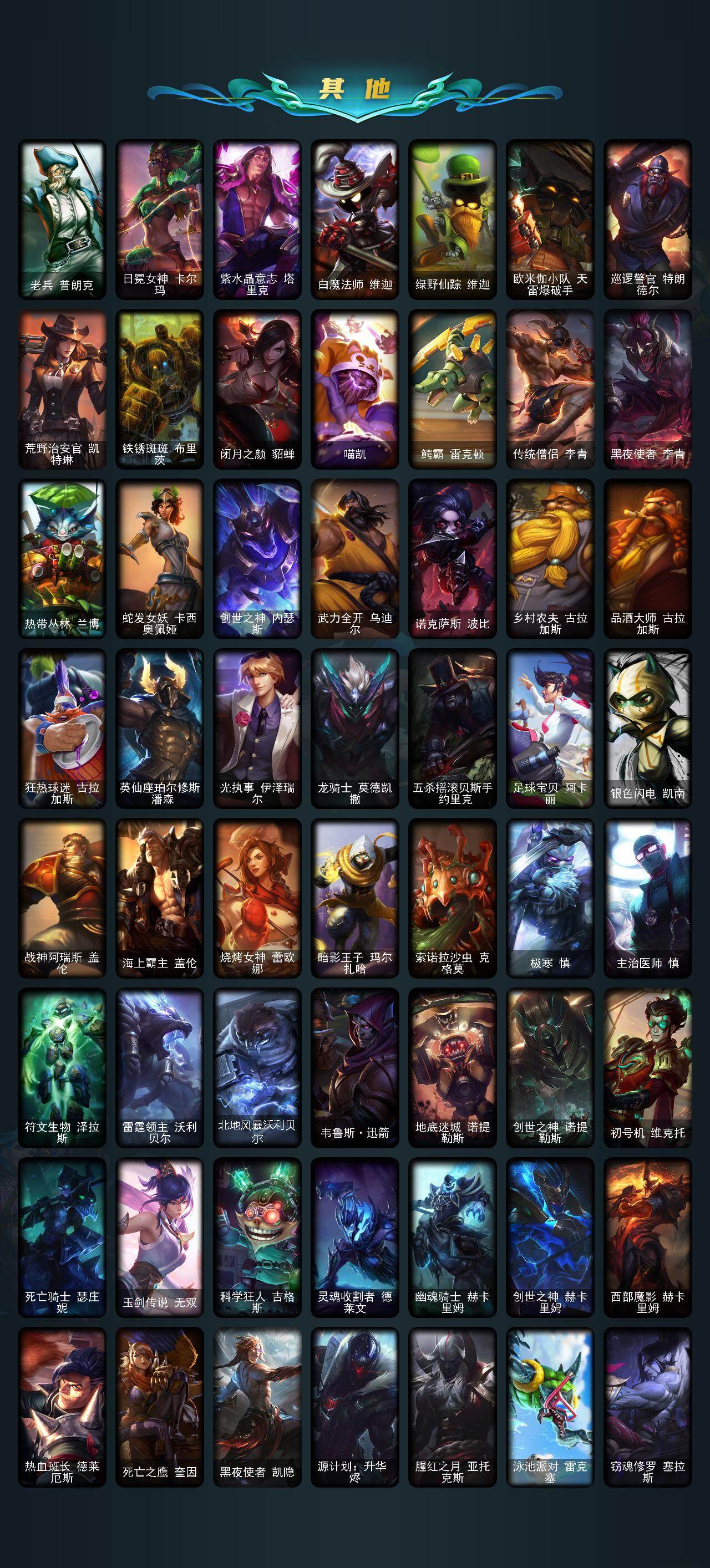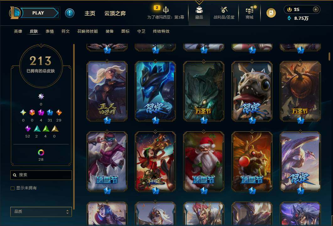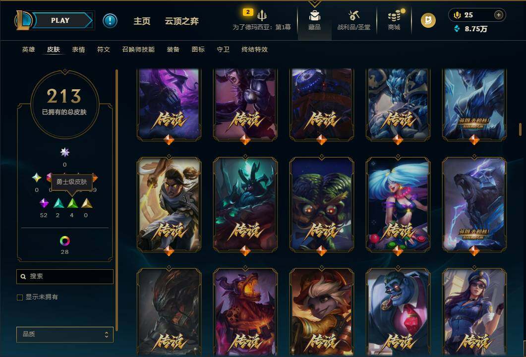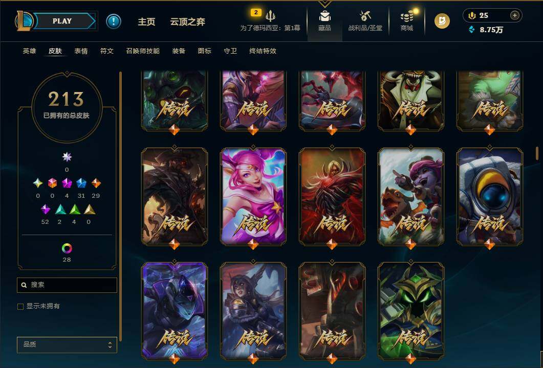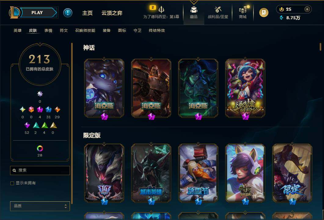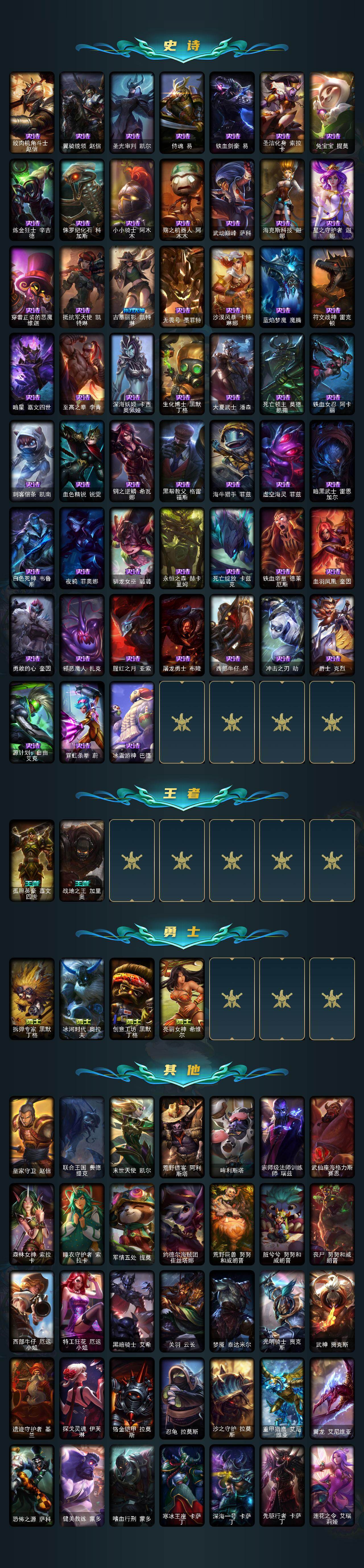 172英雄/213皮肤/4神话/31限定/2臻彩/32炫彩/29传说/52史诗