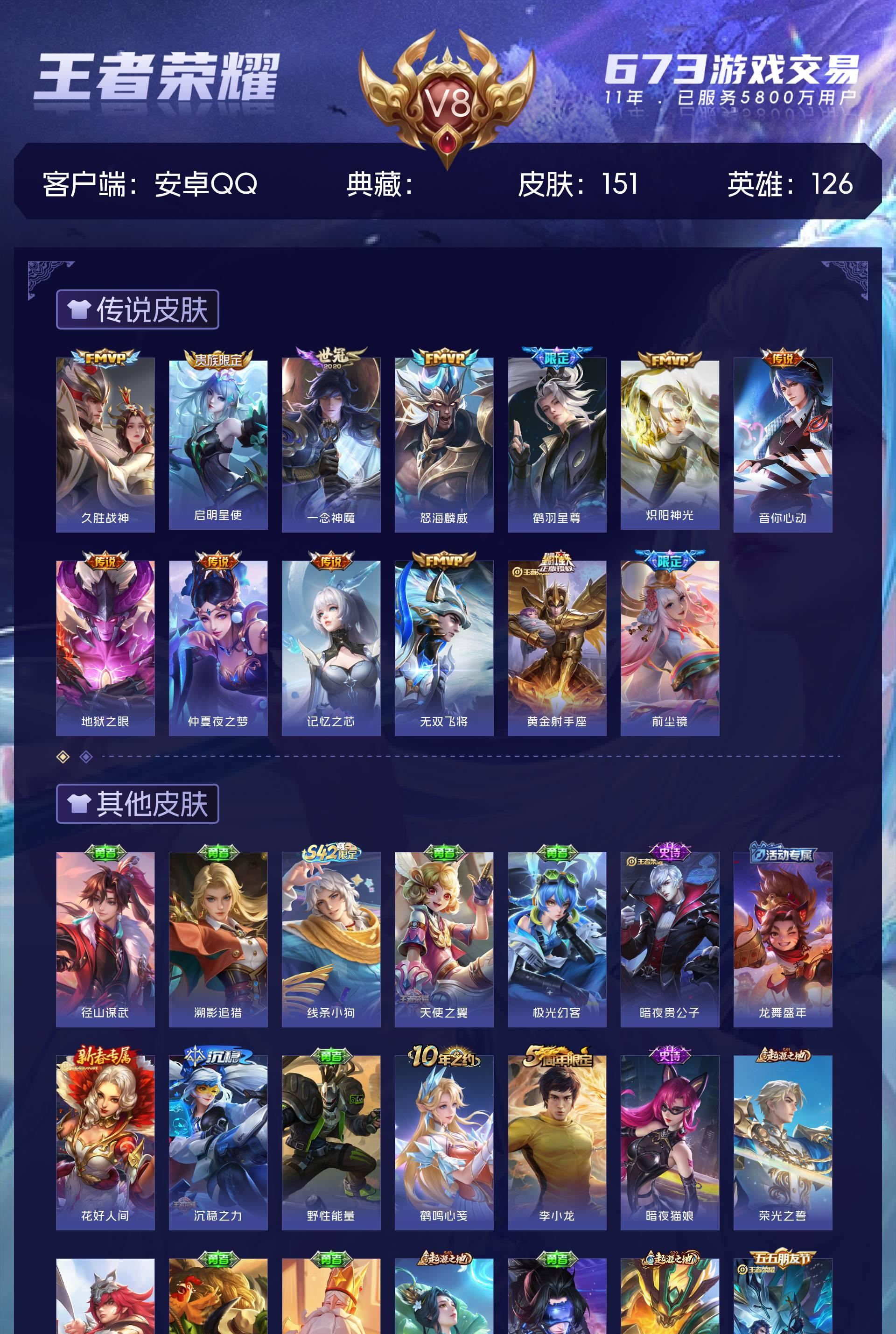 V8 皮肤151 英雄126 最强王者 传说14 其他皮肤142