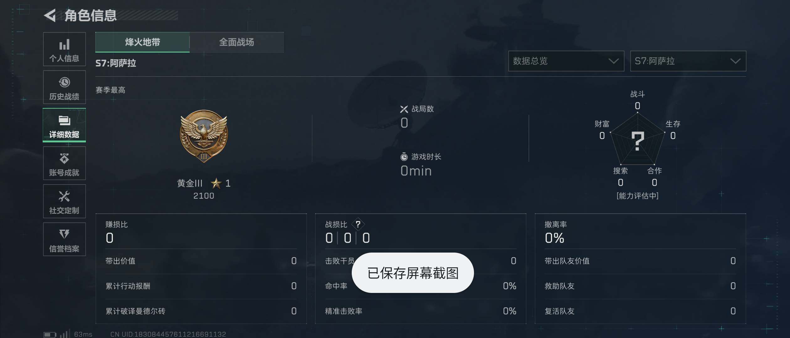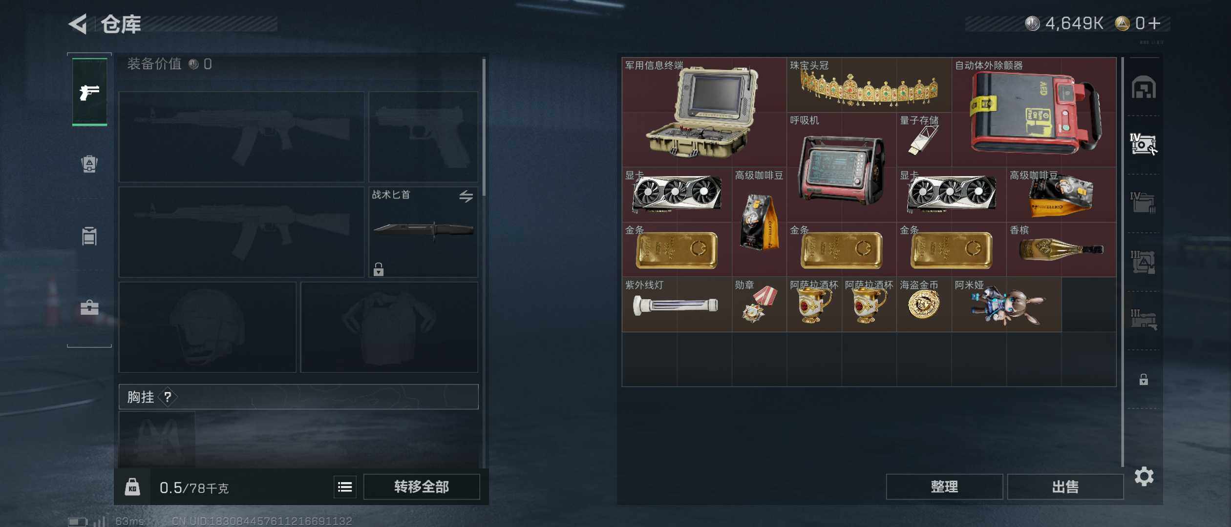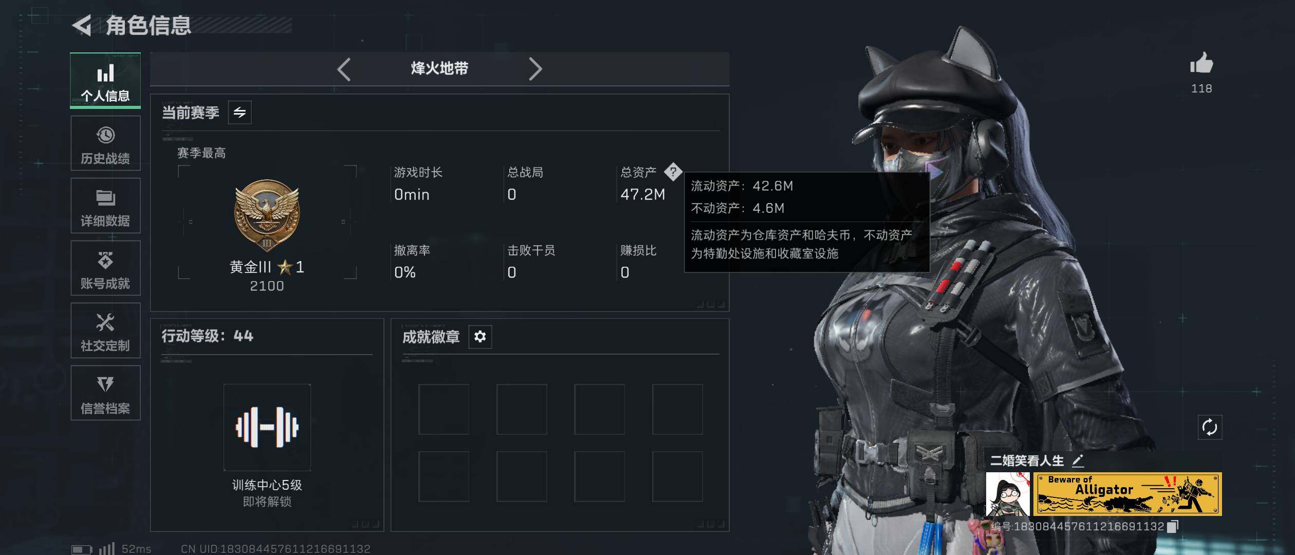 47m总资产-4649k哈伏币-44烽火等级-黄金-1战场等级-无军衔【干员