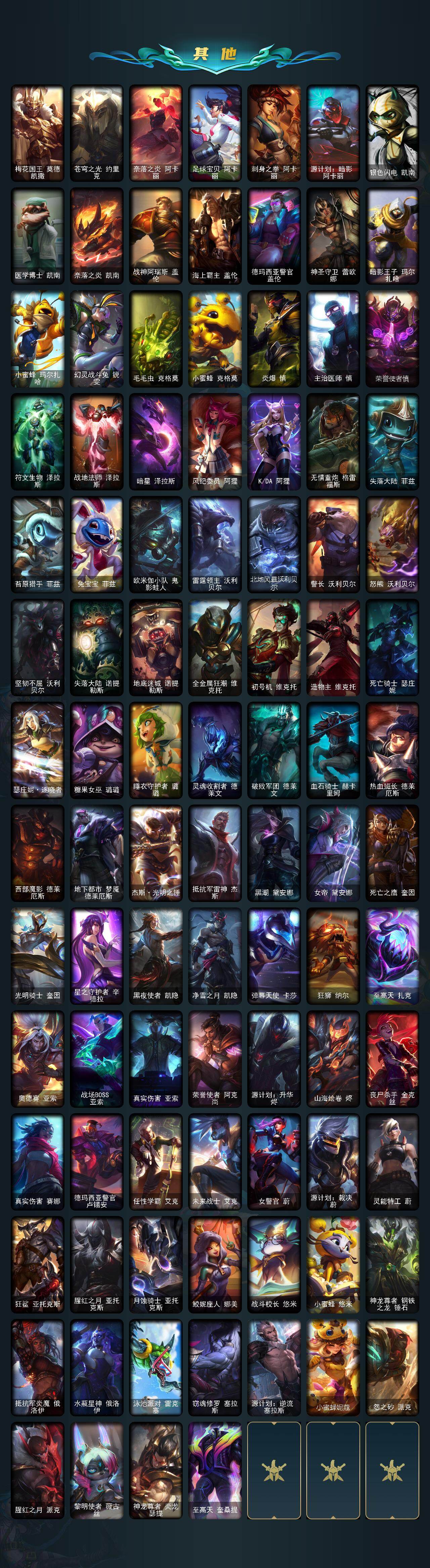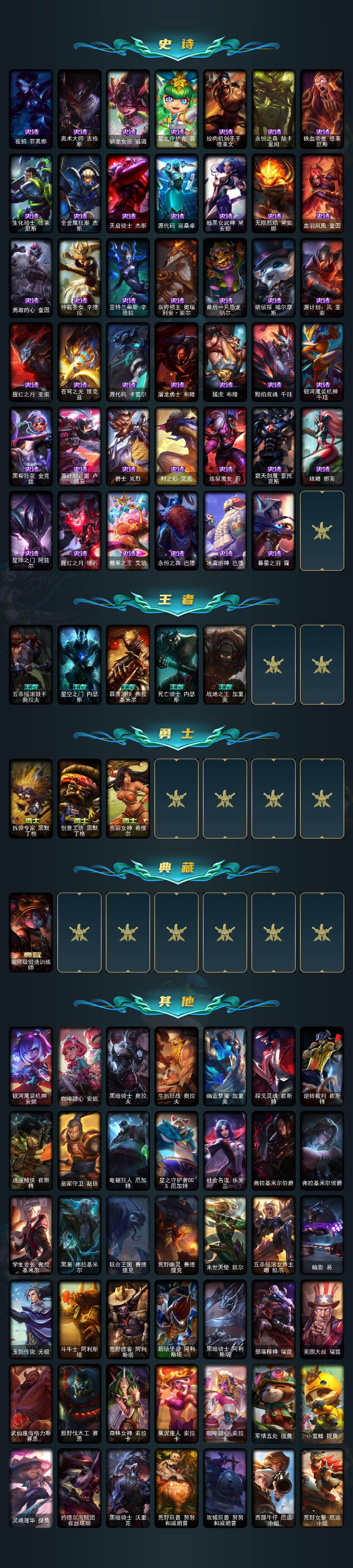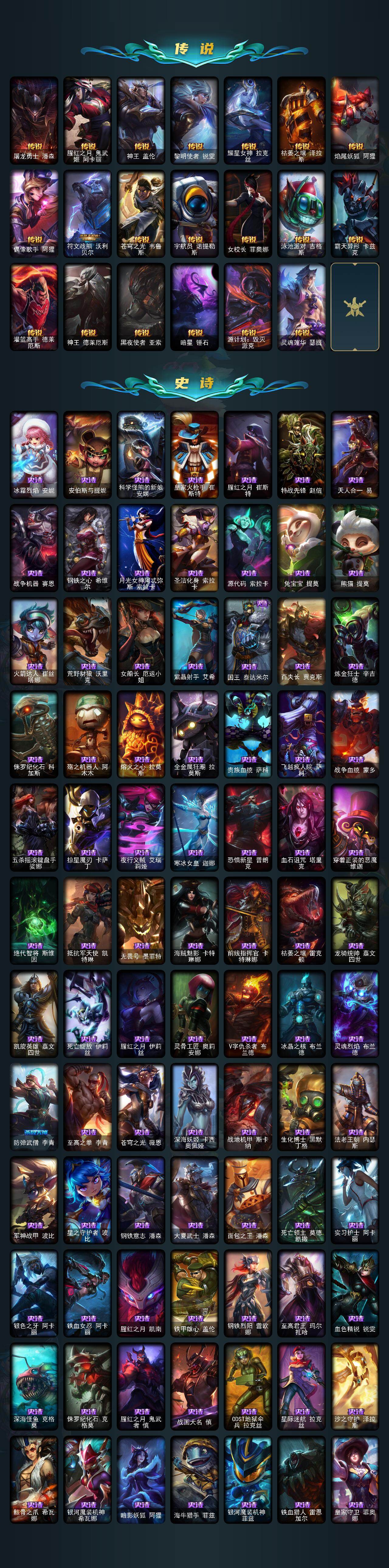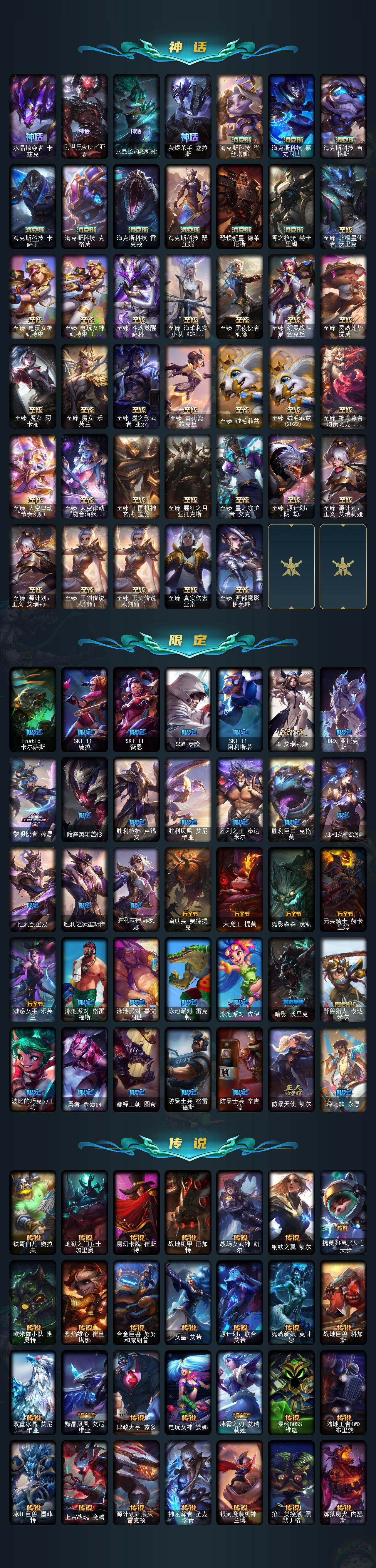 172英雄/525皮肤/48神话/52限定/12臻彩/124炫彩/48传说/125史诗/未定级/