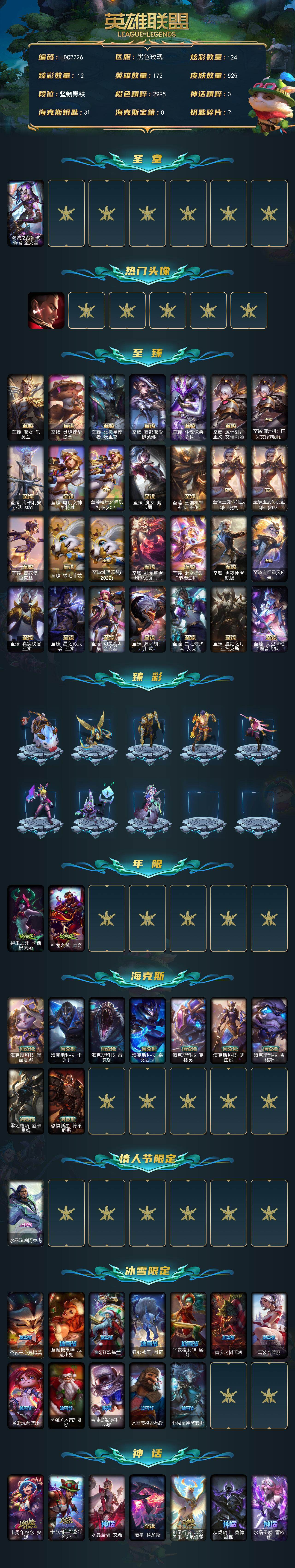 【LDC2226】172英雄/525皮肤/48神话/52限定/12臻彩/124炫彩/48传说/125史诗/未定级/双城之战2破碎者金克丝/觅心游侠卢锡安头像/至臻魔女乐芙兰/至臻灵魂莲华提莫/至臻北极星使者沃里克/至臻西部魔影伊芙琳/至臻斗魂觉醒萨科/至臻源计划正义艾瑞莉娅/至臻源计划:正义艾瑞莉娅(2022)/至臻海珀利安小队X09星环灵风迦娜/至臻电玩女神凯特琳/至臻电玩女神凯特琳(2022)/至臻魔女阿卡丽/至臻王国机神玄武盖伦/至臻玉剑传说武剑仙锐雯/至臻玉剑传说武剑仙(2022)/至臻