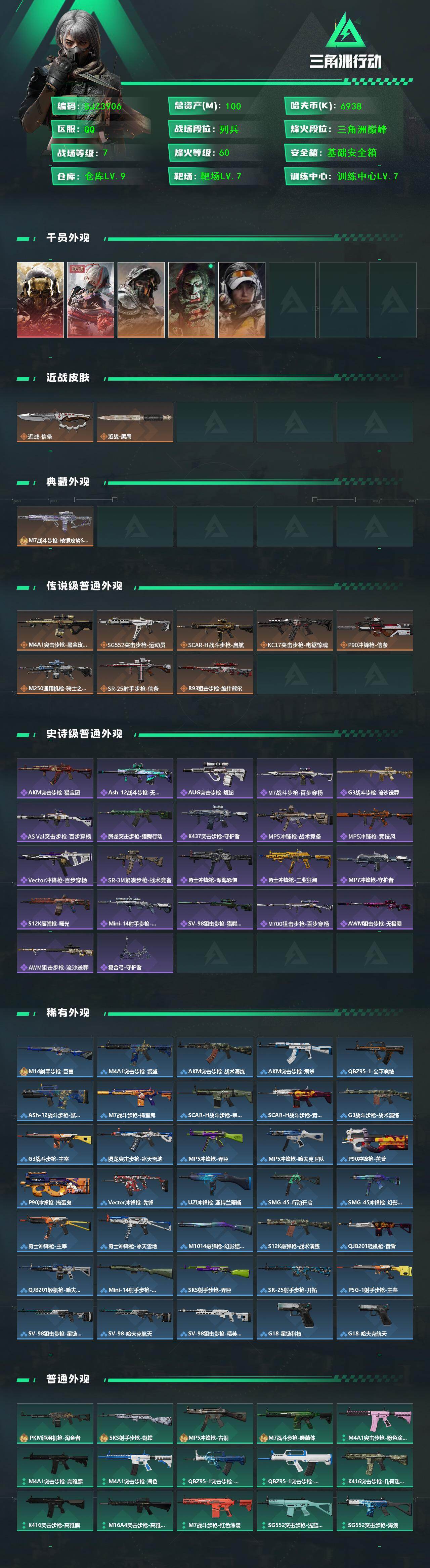 总资产(M):100M/哈夫币(K):6938K/传说枪皮数:9/全面战场等级:7_段位:列兵/烽火地带等级:60_段位:三角洲巅峰/