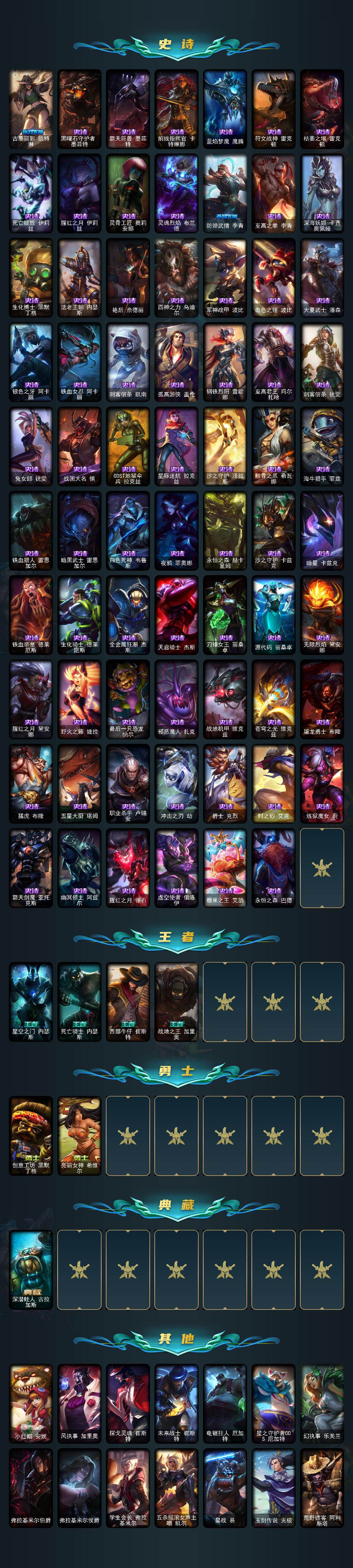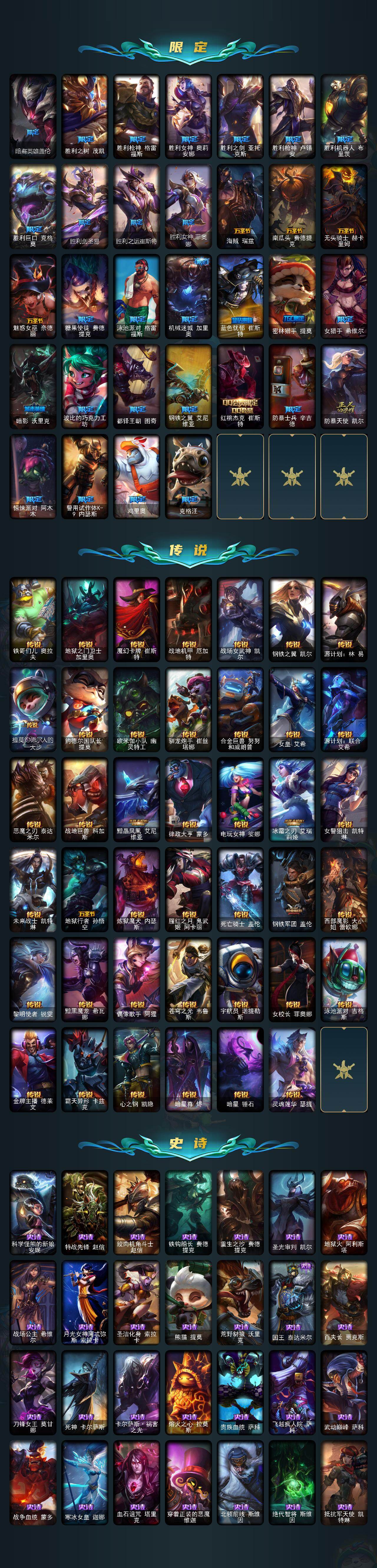172英雄/409皮肤/3终极/15神话/67限定/7臻彩/241炫彩/41传说/97史诗/铂金/