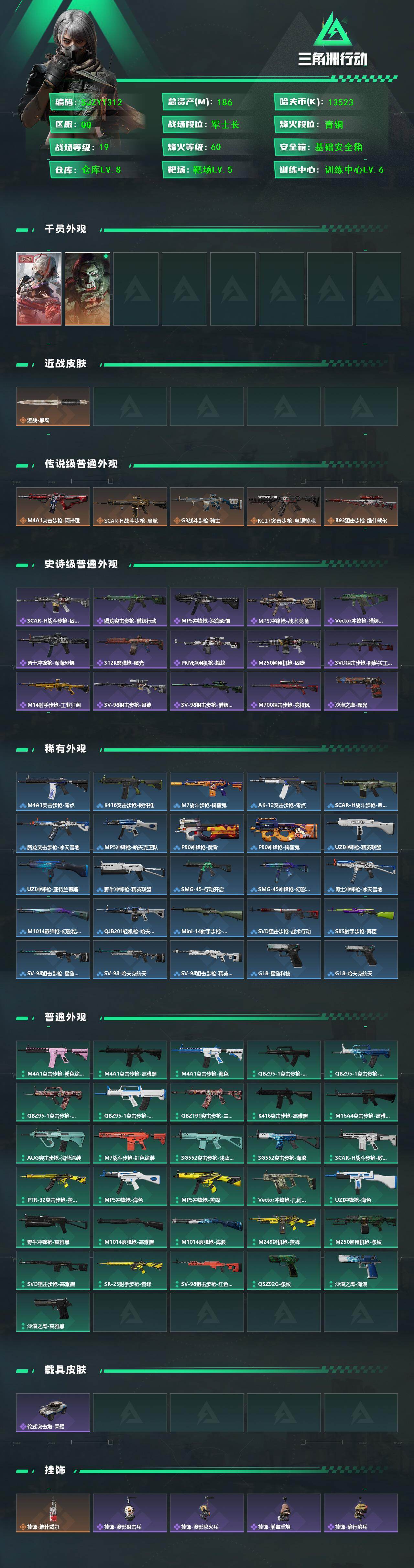 总资产(M):186M/哈夫币(K):13523K/传说枪皮数:5/全面战场等级:19_段位:军士长/烽火地带等级:60_段位:青铜