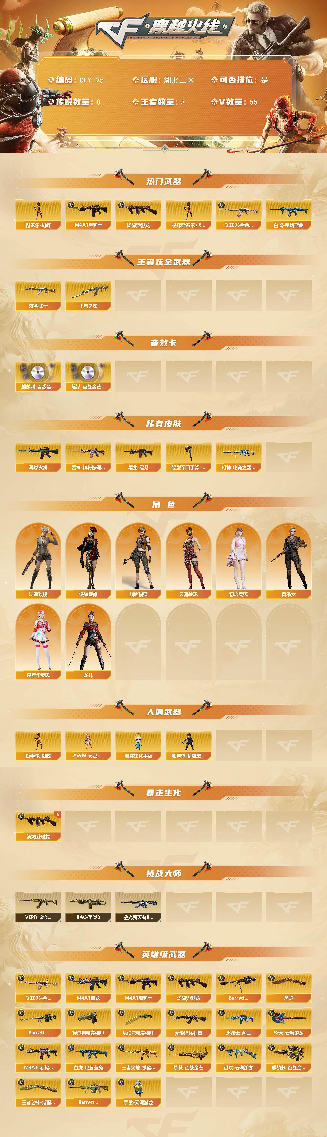 【CFYT25】51V/102级/荣耀元首/3王者/1炫金/4英雄/QBZ03-金色蔷薇/白虎-电玩蓝兔/M4A1_黑骑士/汤姆逊烈龙/蝴蝶/蝴蝶斯泰尔+6烈龙/王者之影/炫金武士/麒麟刺-百战金芒-盛典舞曲音效卡/炼狱-百战金芒-庆典舞曲音效卡/幻神-电竞之星 皮肤/M4A1-再燃火线/雷神-神秘按键 皮肤/黑龙-暗月/轻型军用手斧-再燃火线/沙漠玫瑰/战地猎狐/云海玲珑/初恋灵狐/风暴女/嘉年华灵狐/龙儿/铁骑荣耀/斯泰尔-蝴蝶/加特林-机械猎手/AWM-灵狐-15周年嘉年华/迷你生化手雷/