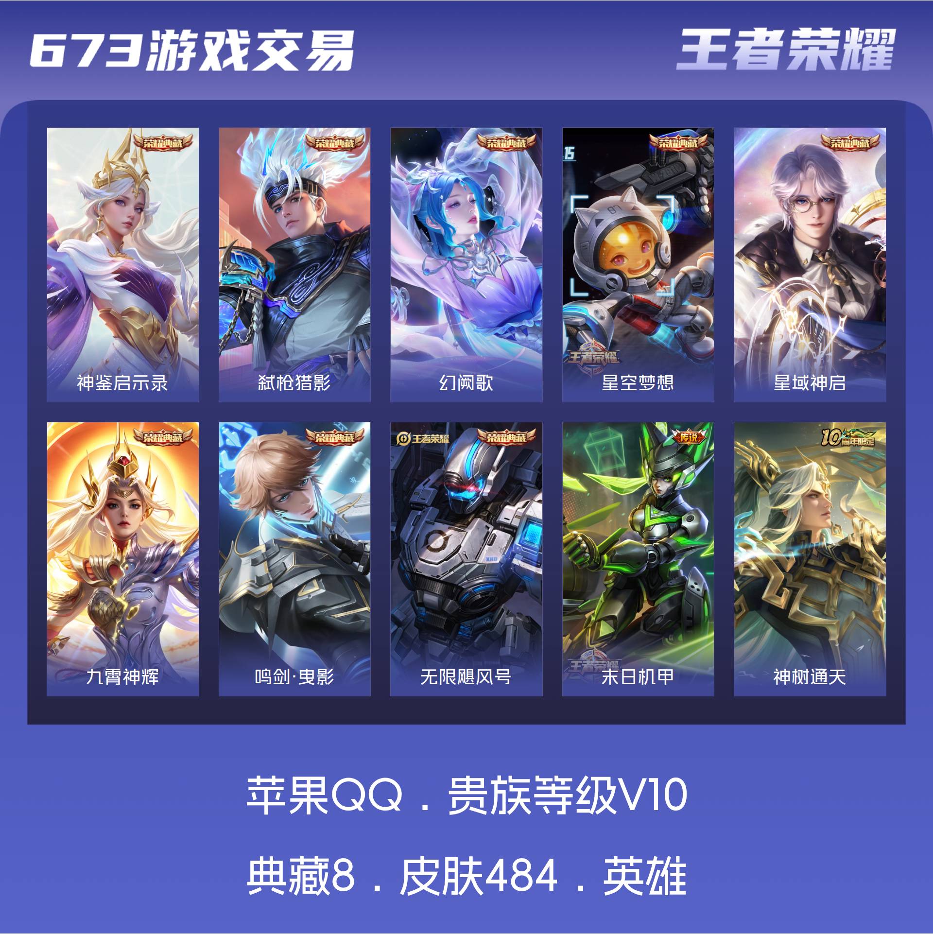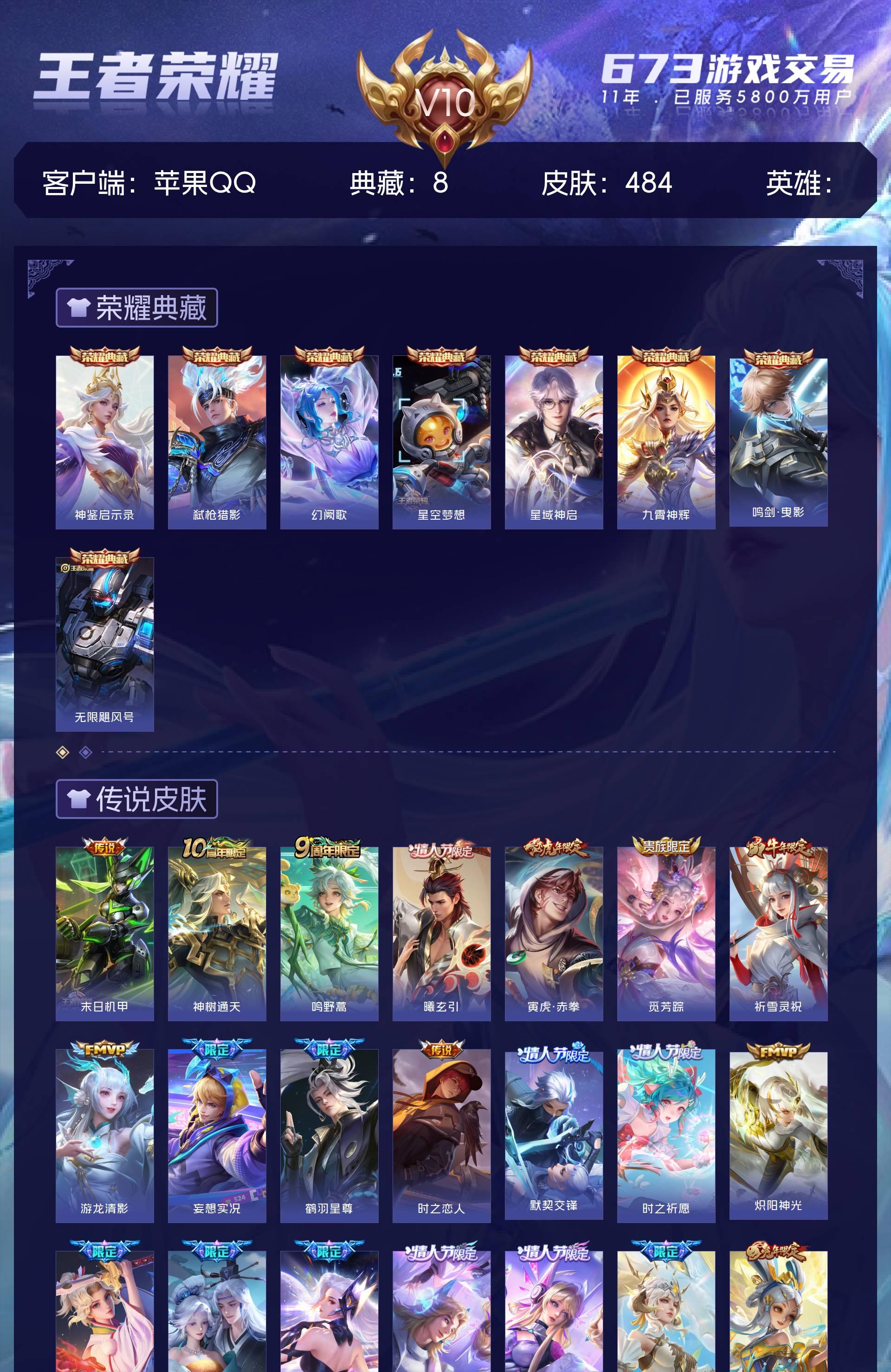 苹果QQ/最强王者/484皮肤/126英雄/8典藏/0珍品无双/0无双/0珍品传说/50传说/152