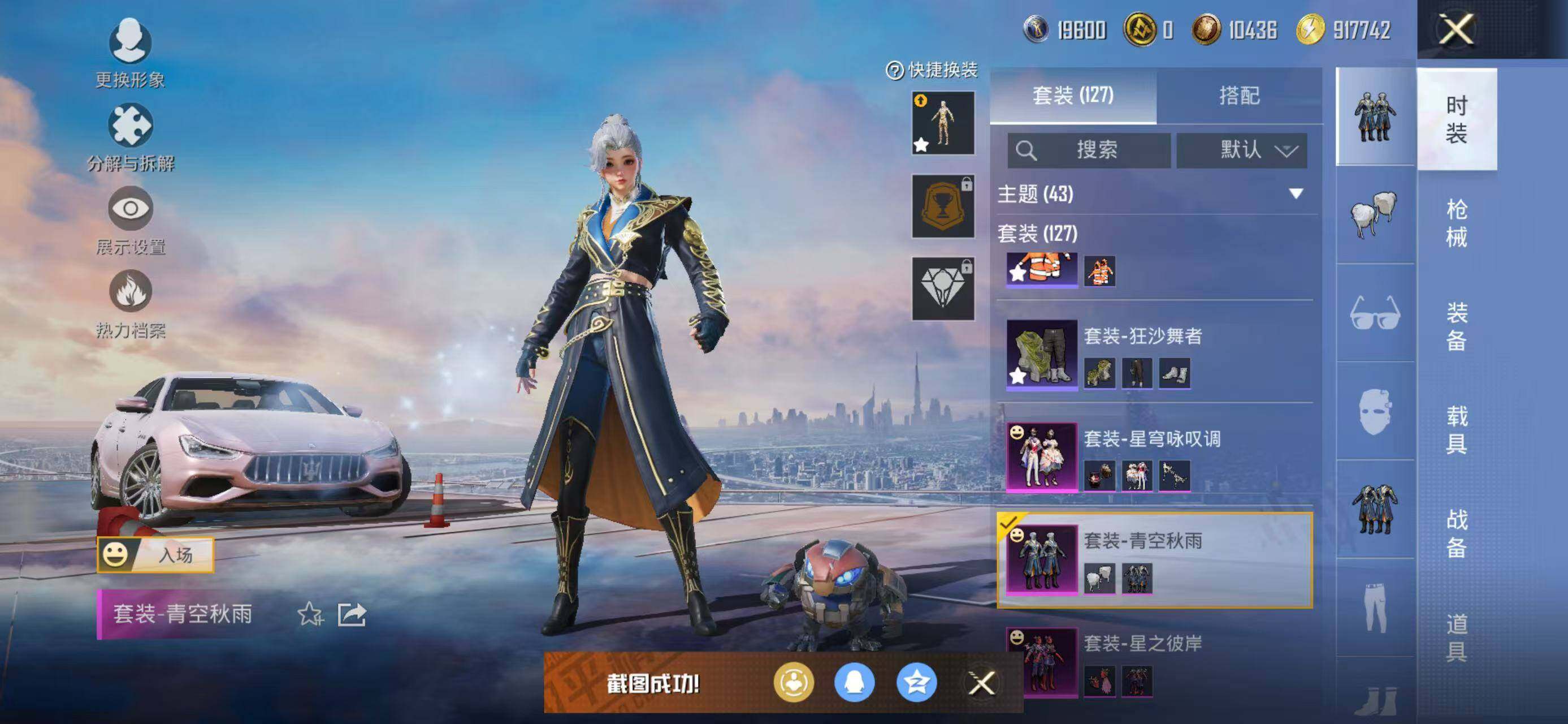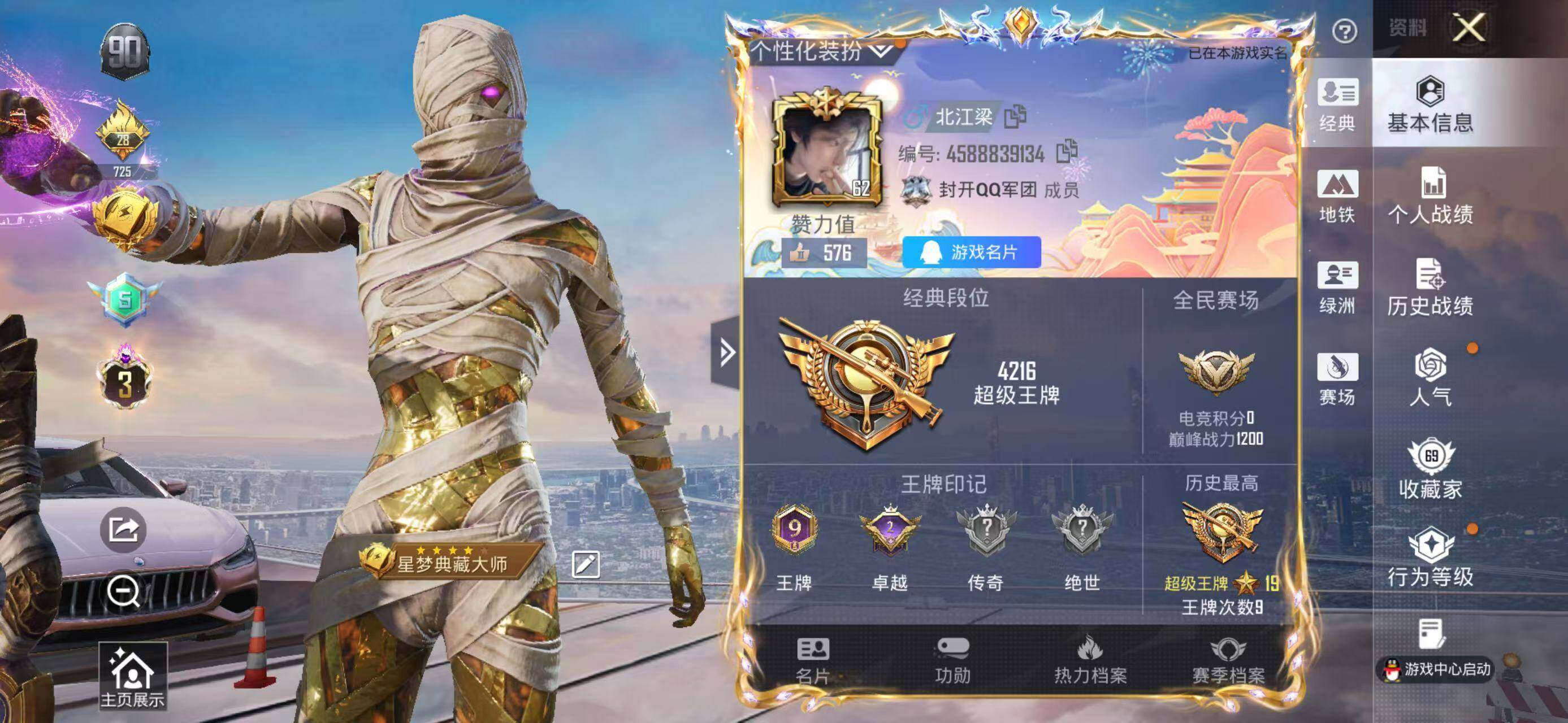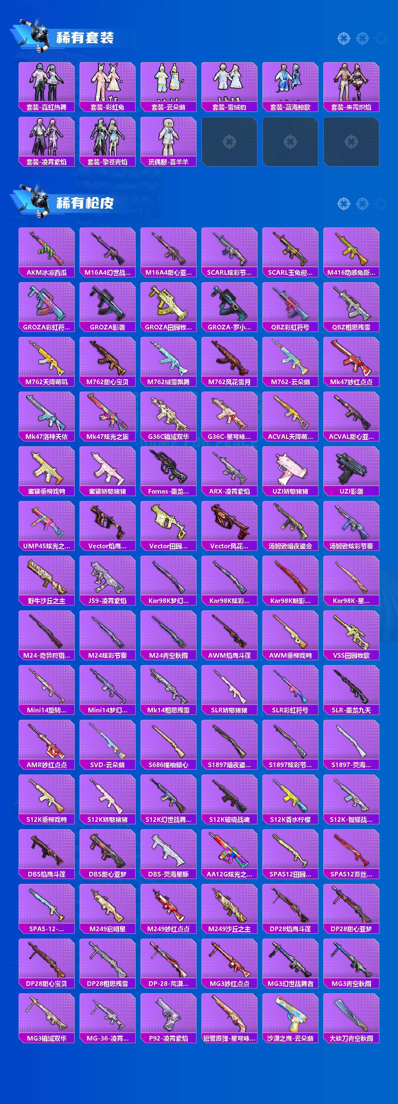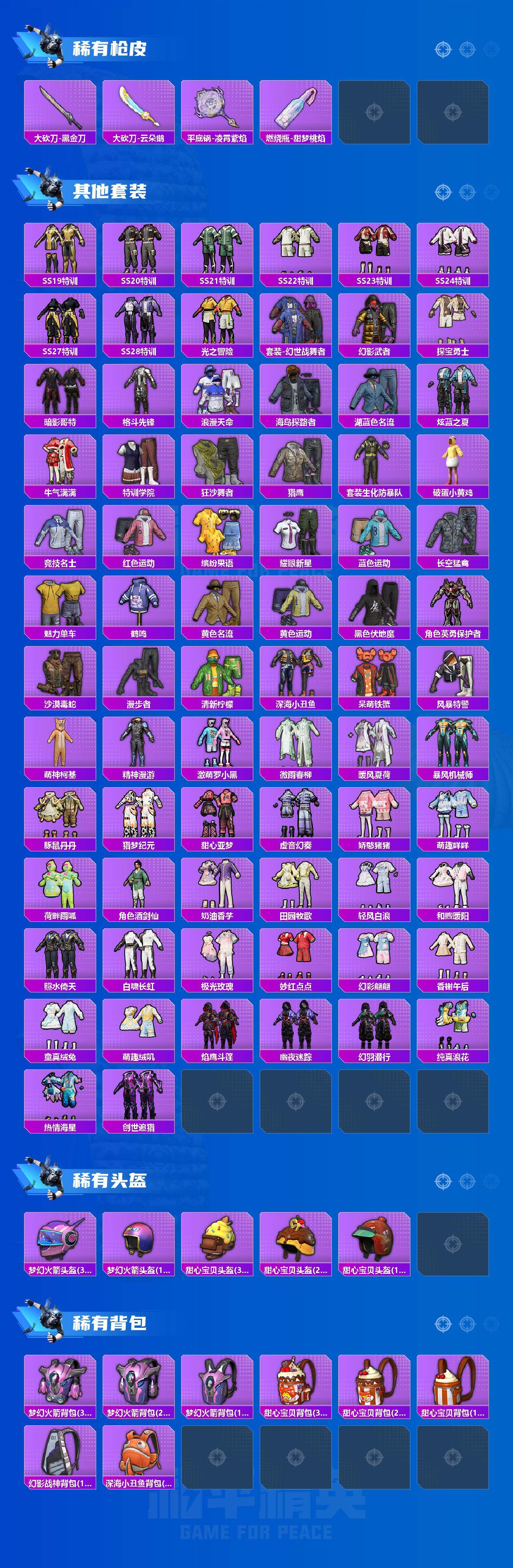 127套装/枪械14/装备249/载具1/战备122/王牌印记9/热力值68815/五级AKM-梦之光华/一级M16A4-垂柳戏鸭/五级SCAR-L-梦幻火箭/三级M416-五爪金龙/五级M416-心之恋语/三级M416-墨龙九天/五级GROZA-镜光银凌/五级UMP45-相思残雪/三级P90-沙丘之主/五级Kar98K-巳巳如意/五级Mk14-精灵梦叶罗丽/五级AMR-智耀战神/五级DP-28