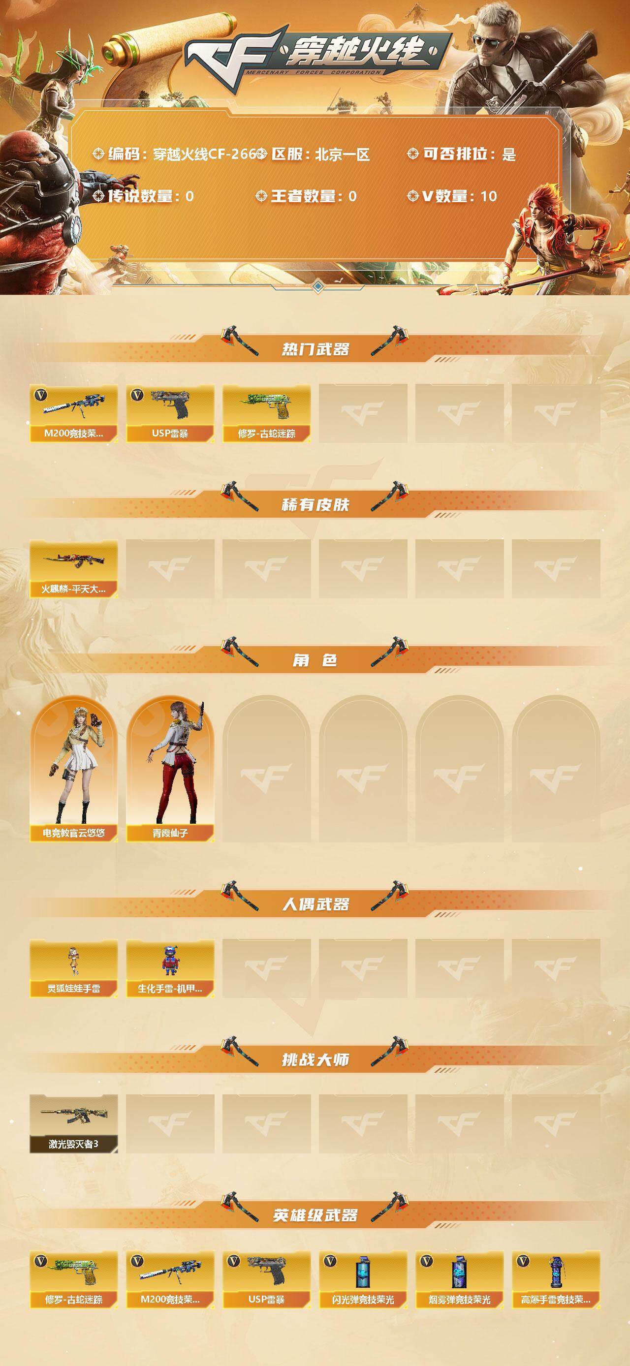 【商品标题】:北京一区-10V-0王者-0炫金【热门武器】:修罗-古蛇迷踪,