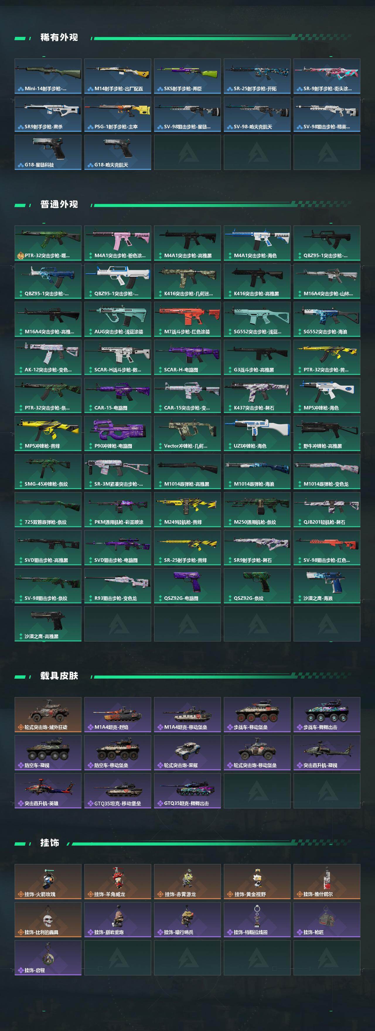 【传说外观】:M4A1突击步枪-阿米娅,ASh-12战斗步枪-鹅鸭杀,SG552突击步枪-运动员,AK-12突击步枪-特斯拉线圈,SCAR-H战斗步枪-启航,G3战斗步枪-骑士,CA