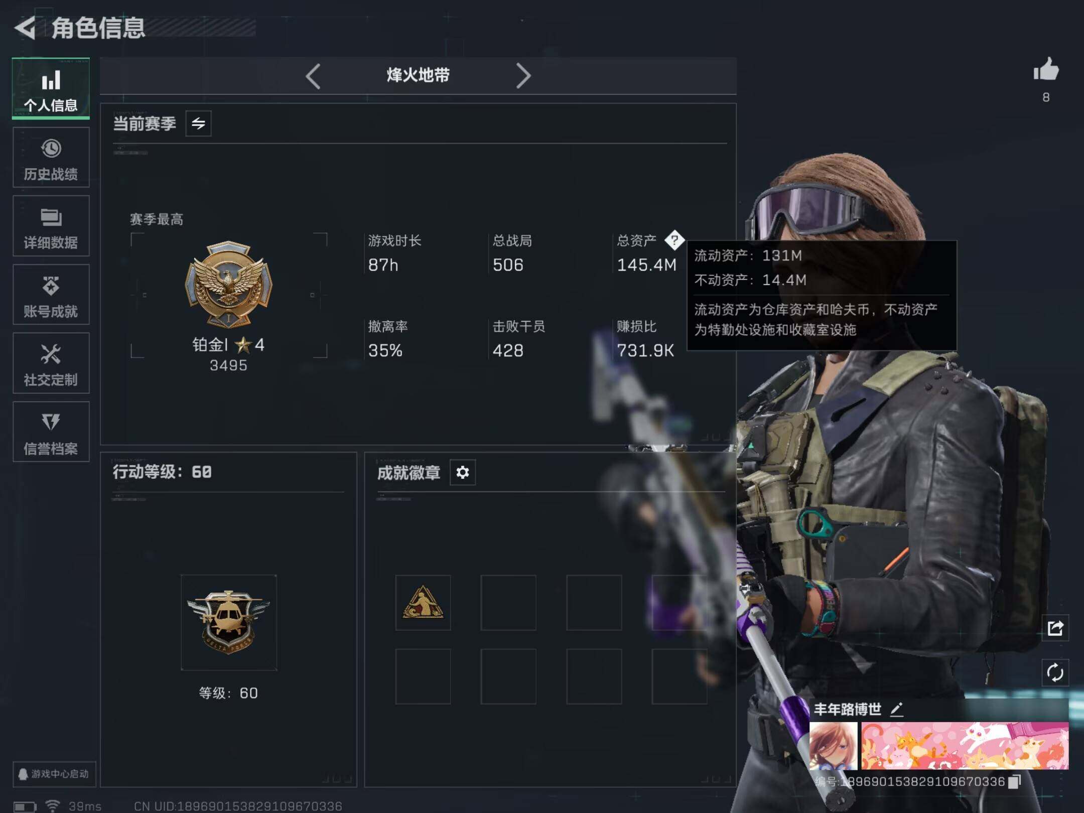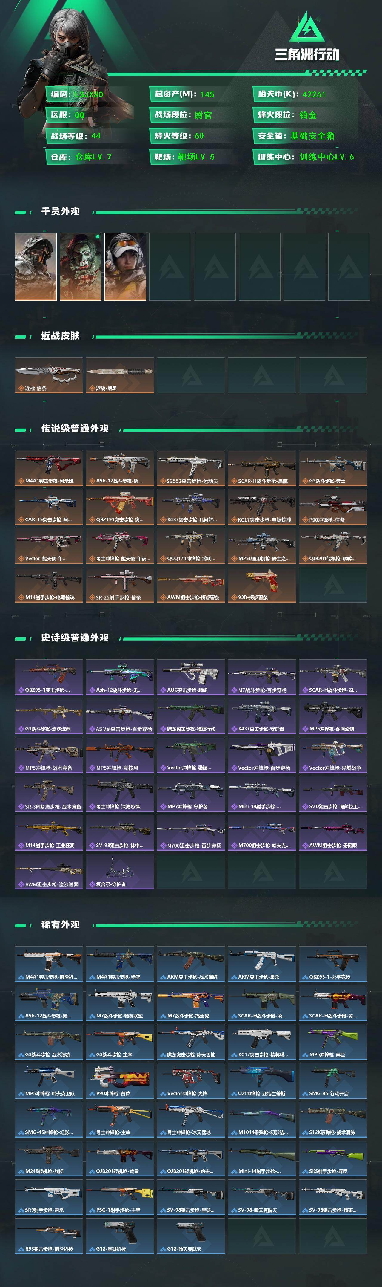 【特价出售/店主推荐】145m总资产-42261k哈伏币-60烽火等级-铂金-44战场等级-尉官
