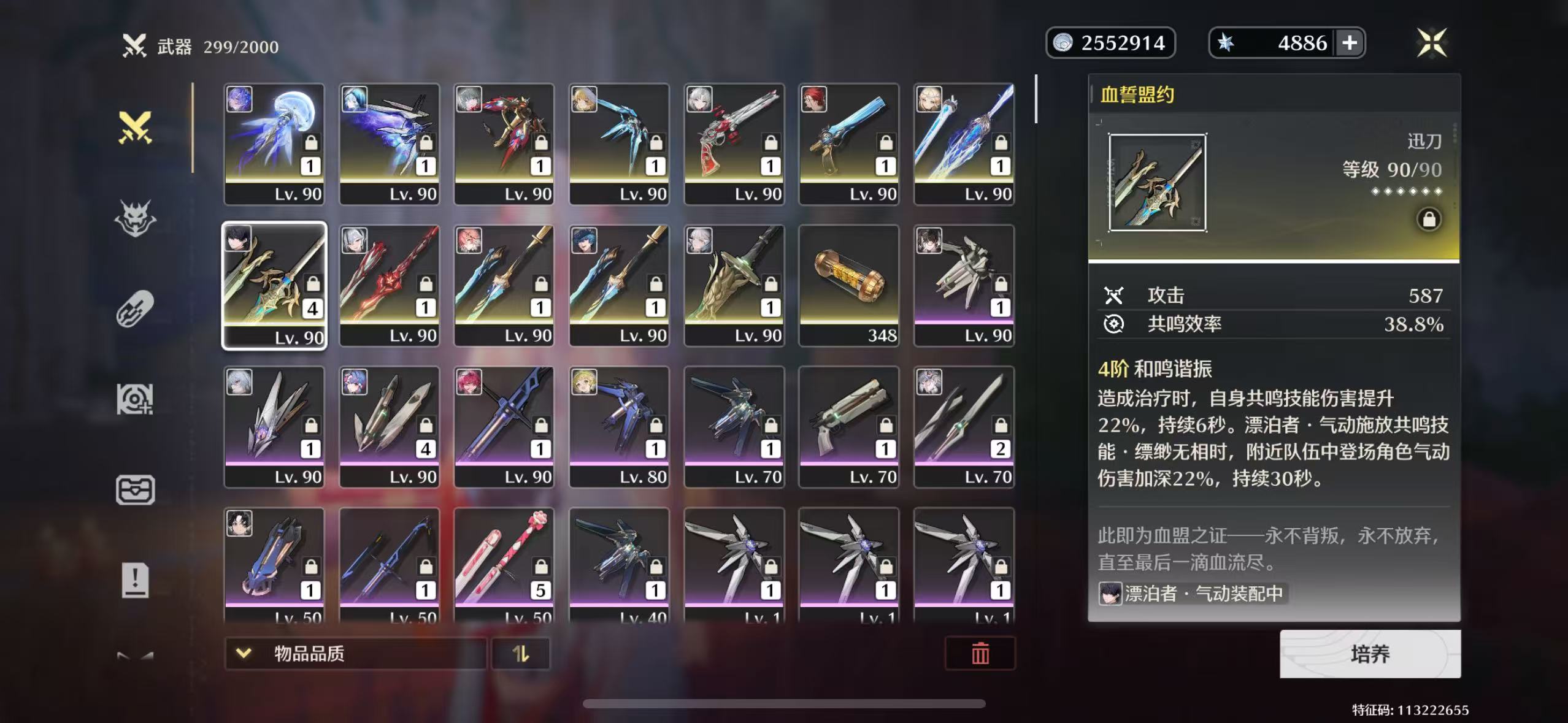 80级共43黄五星角色21个五星武器12个80联觉8索拉4886星声6唤声涡纹5浮金波纹【五星角色】布兰特长离露帕弗洛洛卡提希娅赞妮坎特蕾拉菲比洛可可珂莱塔