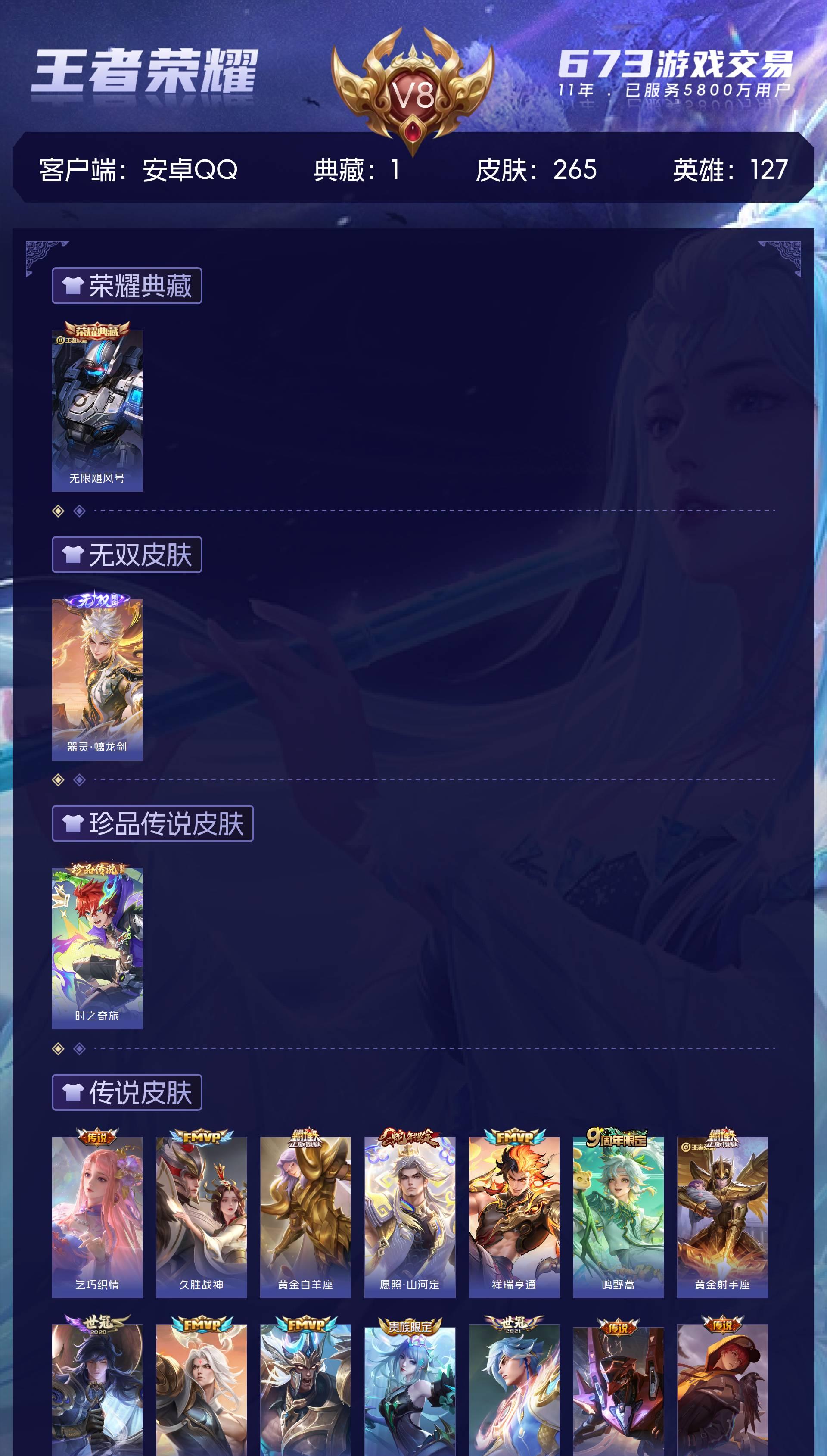 安卓QQ/至尊星耀/265皮肤/127英雄/1典藏/0珍品无双/1无双/1珍品传说/17传说/72史
