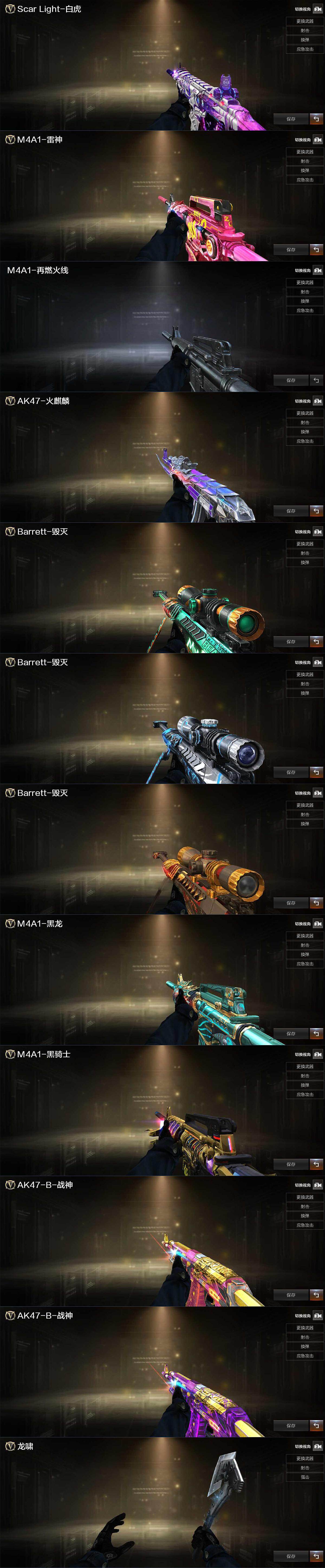 【音效卡】:AK47-火麒麟音效卡,M4A1-黑龙音效卡,M4A1-黑骑士音效卡,Barrett-毁灭音效卡,Scar Light-白虎音效卡,Barrett-碧霄极光音效卡,炼狱-百战金芒-庆典舞曲音效卡