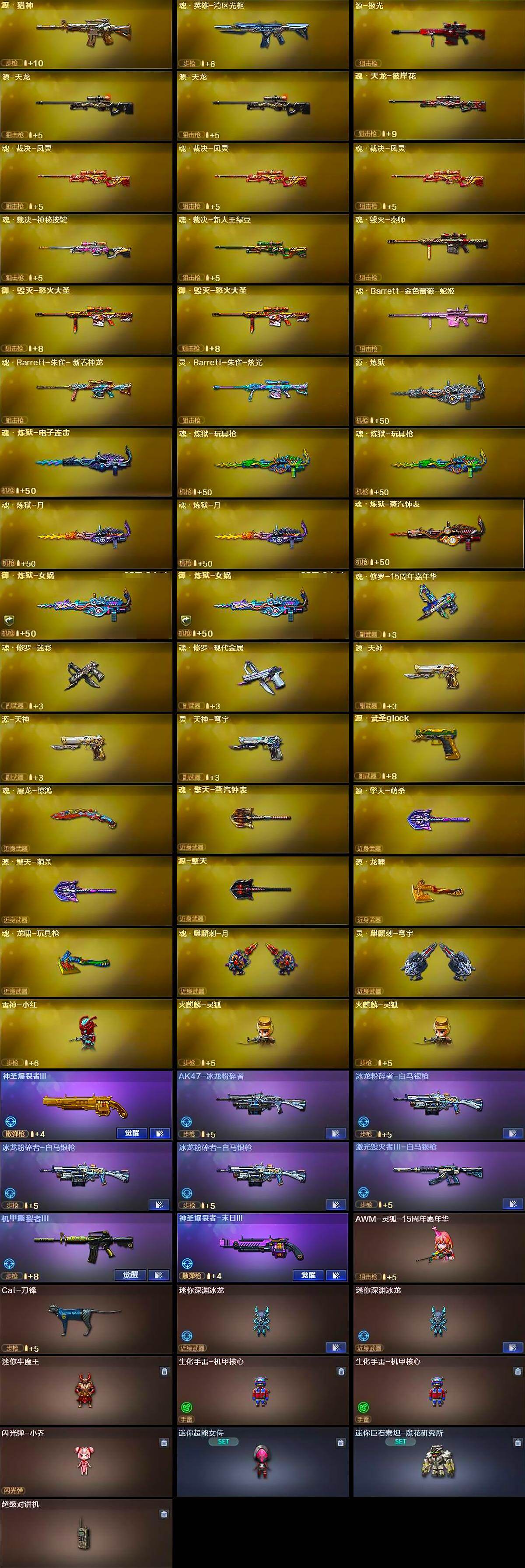 【热门武器】:QBZ03-金色蔷薇,M200-幻神,金色小号,Cat-刀锋,M4A1-黑骑士,汤姆逊-烈龙*6,加特林-炼狱,雷神-小红,USP-雷暴,COP 357-幻灵*2,沙鹰-修罗*4