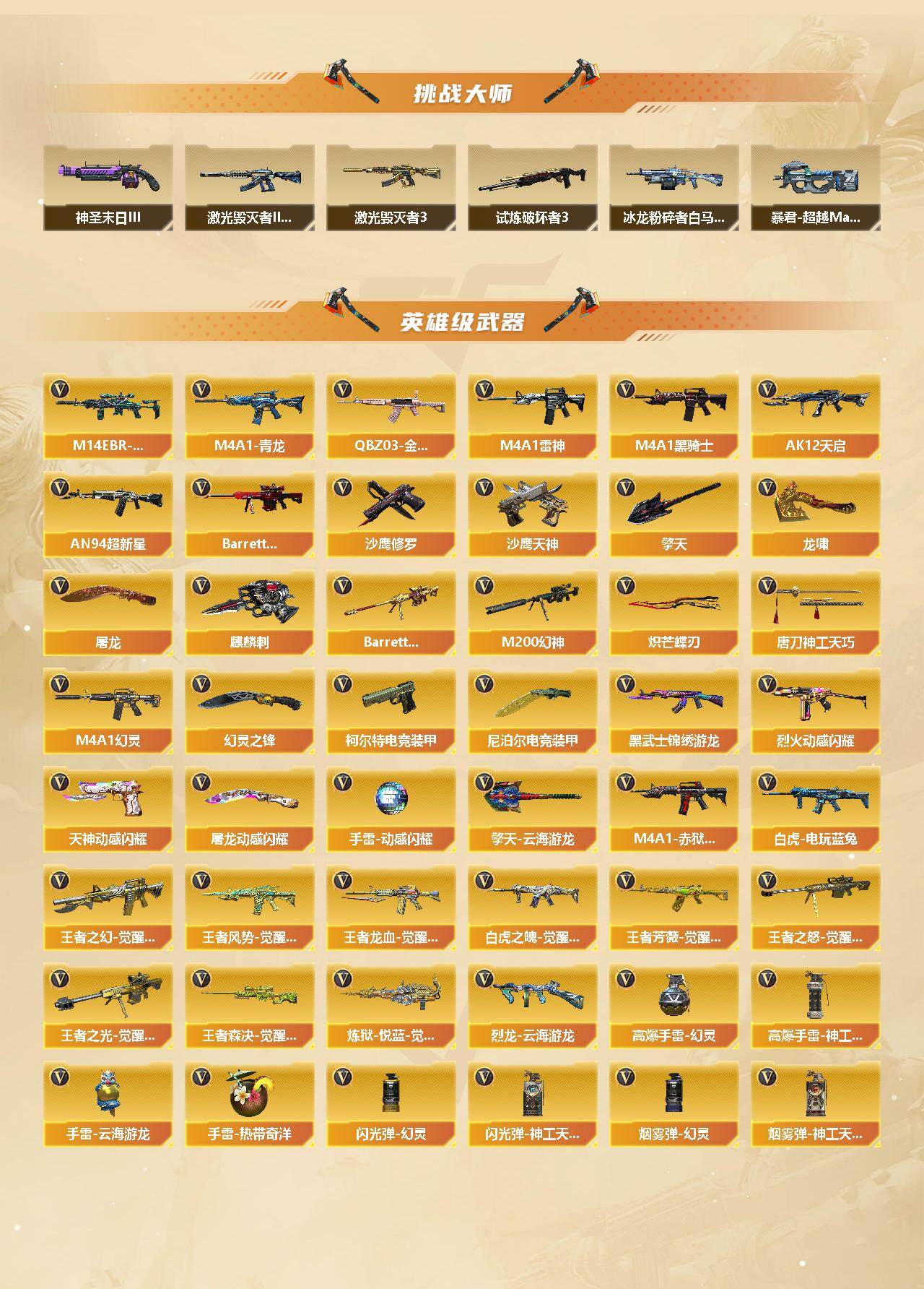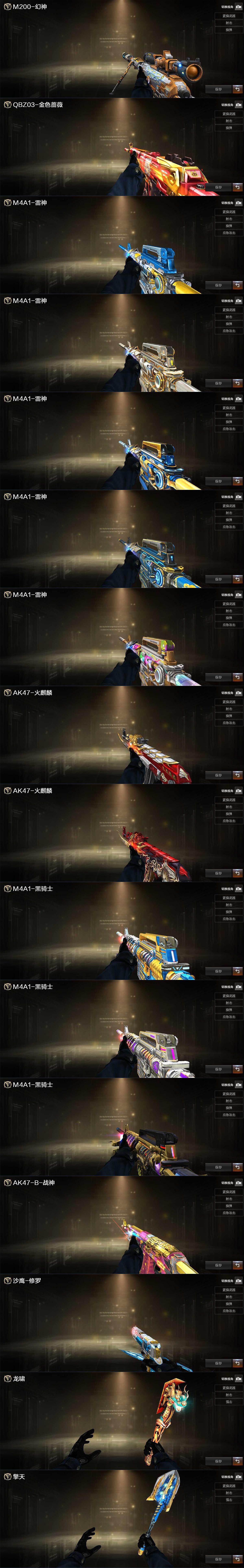 【热门武器】:传说暗裔,传说圣灵,传说夜影,传说辉光,QBZ03-金色蔷薇,M14EBR-玄武,M4A1-青龙,M200-幻神,白虎-电玩蓝兔,炼狱-迷你小钢,毒蜂,M4A1-黑骑士,沙鹰-修罗,柯尔特-赛博朋克,炽芒蝶刃