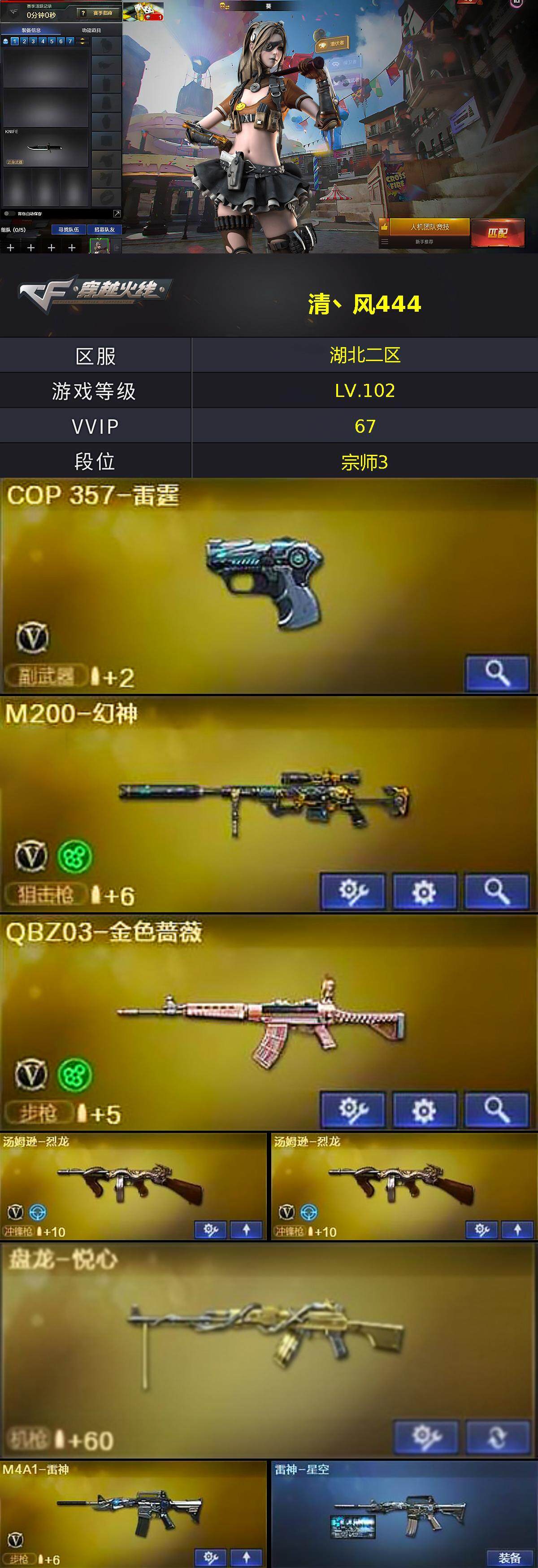 【热门武器】:QBZ03-金色蔷薇,M200-幻神,死亡之眼,M4A1-黑骑士*2,汤姆逊-烈龙*2,沙鹰-修罗*5