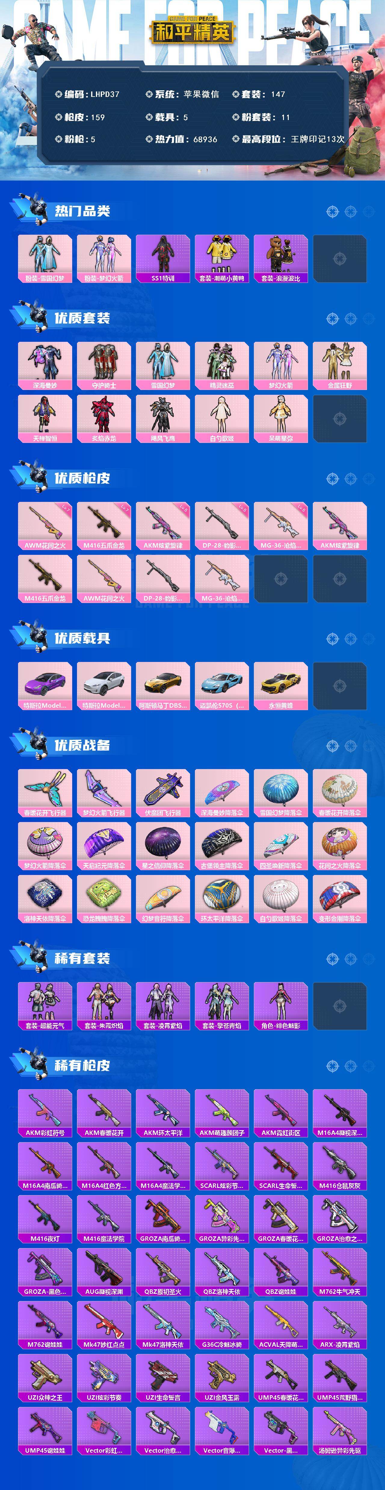 【特价出售/店主推荐】苹果 微信-11粉装-5特效枪-5载具-5粉色飞行器-68936热力值-13王牌印记-147套装-159枪皮【热门品类】:粉装-雪国幻梦,粉装-梦幻火箭,套装-SS1特训,套装-潮萌小黄鸭,套装-浪漫波比【粉色套装】:粉装-深海曼妙,粉装-守护骑士,粉装-雪国幻梦,粉装-精灵迷巫,粉装-梦幻火箭,粉装-金属狂野,粉装-天禅智恒,粉装-炙焰赤龙,粉装-飓风飞鹰,角色-白勺歌姬