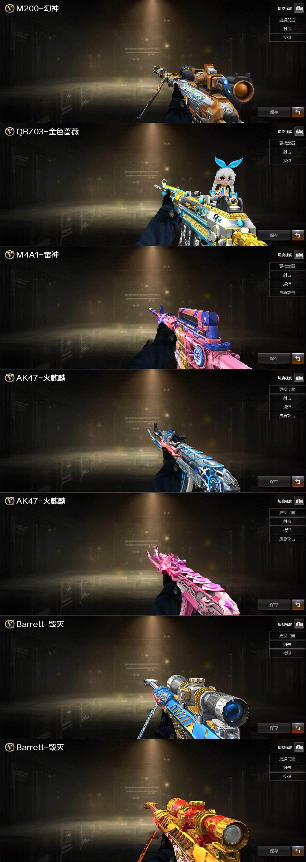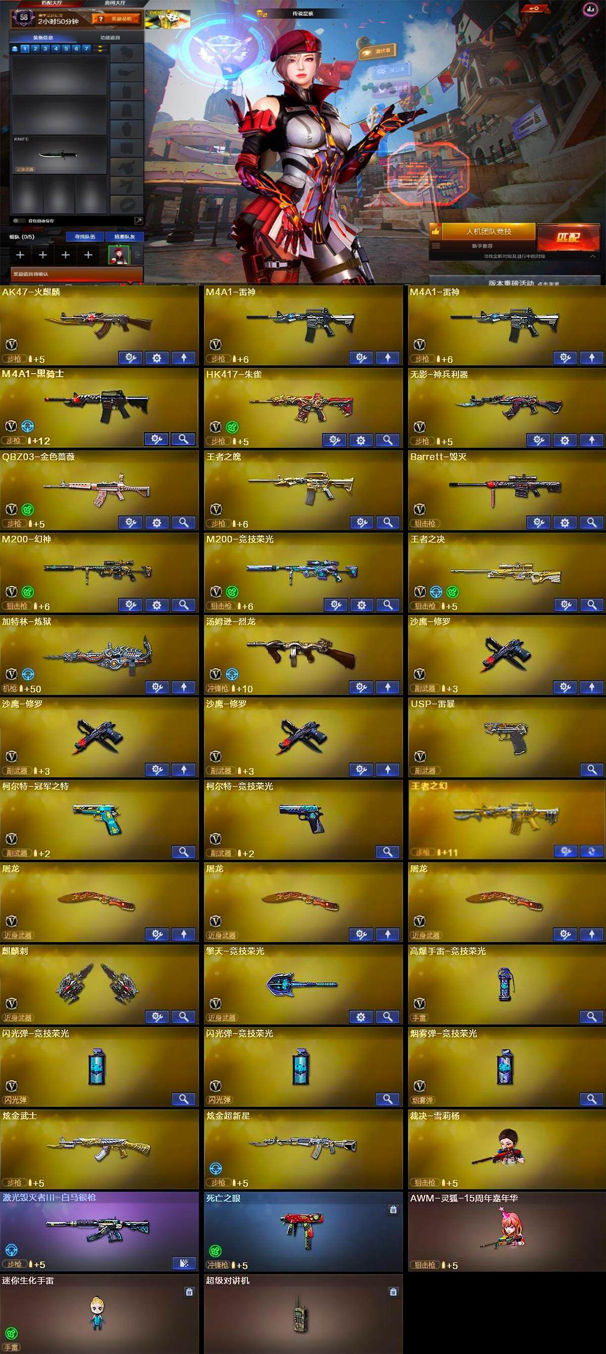 【热门武器】:QBZ03-金色蔷薇,HK417-朱雀,M200-幻神,M200-竞技荣光,死亡之眼,柯尔特-冠军之特,M4A1-黑骑士,汤姆逊-烈龙,加特林-炼狱,裁决-雪莉杨,USP-雷暴,沙鹰-修罗*3,金刚伞