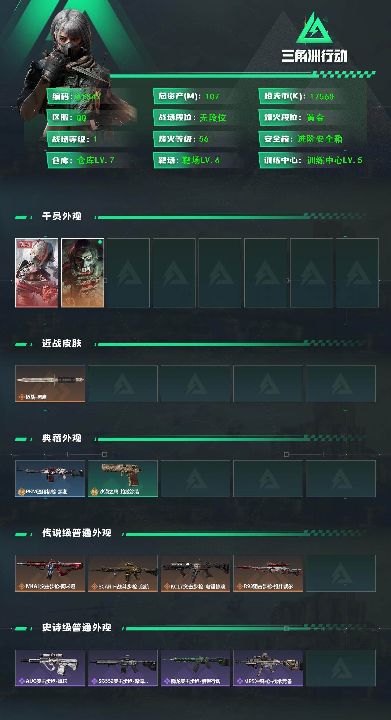 可直接换绑 总资产107m 【店主推荐捡漏号!可直接换绑】 17560k哈伏币-107m流动资产-56烽火等级-黄金-1战场等级-无军衔